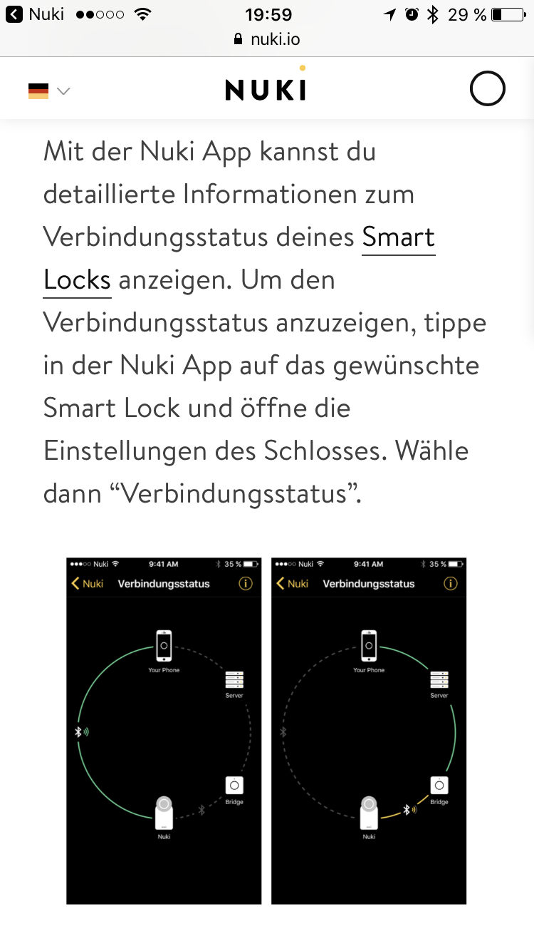 Wo wir gerade dabei sind. Ich mache die Öffnung nur über Nuki. Aber die Bluetooth Variante,also wenn Nuki das Handy erkennt. Klappt völlig Problemlos. Das merkwürdige finde ich nur das wenn ich vor der Tür stehe das Signal in der Nukkiapp schwach Anzeigt. Erst wenn ich das Handy von außen direkt auf Höhe des Schlosses halte springt das Sinal auf stark. Ist das bei euch auch so? Könntet ihr das heute mal testen?