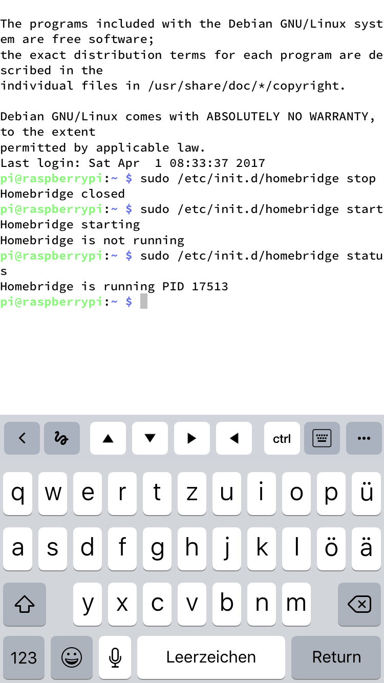 Alles anzeigen#!/bin/sh ### BEGIN INIT INFO # Provides: homebridge # Required-Start: $network $remote_fs $syslog # Required-Stop: $remote_fs $syslog # Default-Start: 2 3 4 5 # Default-Stop: 0 1 6 # Short-Description: Start daemon at boot time for homebridge # Description: Enable service provided by daemon. ### END INIT INFO export PATH=$PATH:/usr/local/bin export NODE_PATH=$NODE_PATH:/usr/local/lib/node_modules PID=`pidof homebridge` case "$1" in start) if ps -p $PID > /dev/null 2>&1; then echo "Homebridge is already running" else su - root -c "homebridge > /dev/null 2>&1 &" echo "Homebridge starting" $0 status fi ;; stop) if ! ps -p $PID > /dev/null 2>&1; then echo "Homebridge is not running" else kill $PID echo "Homebridge closed" fi ;; restart) if ! ps -p $PID > /dev/null 2>&1; then $0 start else $0 stop $0 start fi ;; status) if ps -p $PID > /dev/null 2>&1; then echo "Homebridge is running PID $PID" else echo "Homebridge is not running" fi ;; *) echo "Usage: $0 {start|stop|status|restart}" exit 1 ;; esac exit 0 -