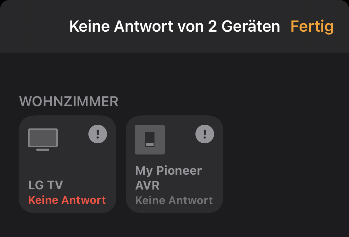 Code[21/02/2021, 10:29:18] Registering accessory 'homebridge-pioneer-avr.pioneerAvrAccessory' [21/02/2021, 10:29:19] --- [21/02/2021, 10:29:20] [My Pioneer AVR] Initializing pioneerAvrAccessory accessory... [21/02/2021, 10:29:21] [My Pioneer AVR] Discovering inputs Error: async hook stack has become corrupted (actual: 72, expected: 44) [21/02/2021, 10:29:22] [HB Supervisor] Homebridge Process Ended. Code: 1, Signal: nullDas Plugin mag meinen AVR nicht so wirklich