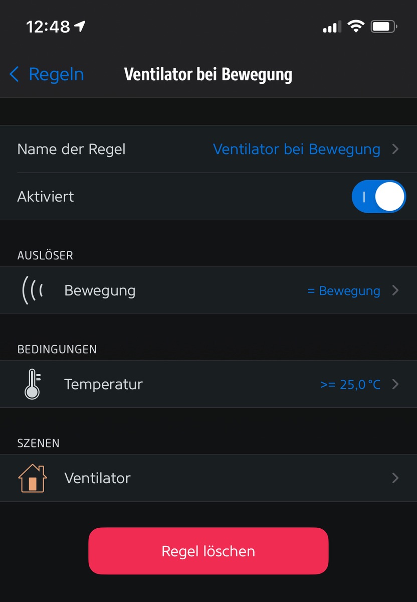 Wenn Bewegungsmelder erkennt Bewegung - unter der Bedingung Temperatur ist Gleich oder Höher 25,0 Grad - dann Ventilator einschalten.