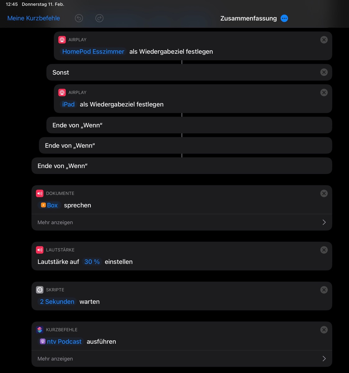 Habe einen Kurzbefehl, der über Signal die Lichter im Zimmer meine Tochter blinken lässt und im Anschluss eine mp3.Datei über ihren HomePod Mini spielt. = Aufruf zum Essen zu kommen (-;