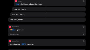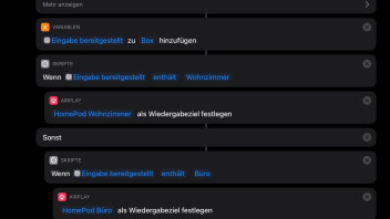 Dazu habe ich diesen Kurzbefehl erstellt und im Testmodus (ohne Sprachabfrage sondern mit Texteingabe) klappt es auch. Im Livetest spielt allerdings die Übergabe der Sprachauswahl nicht mit der HomePod-Auswahl zusammen und es bricht ab.