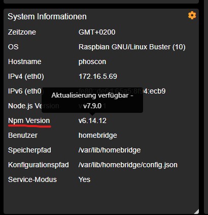 am Dashboard in der homebridge wird nodejs mit 16.13.1 angezeigt und npm mit 6.14.15