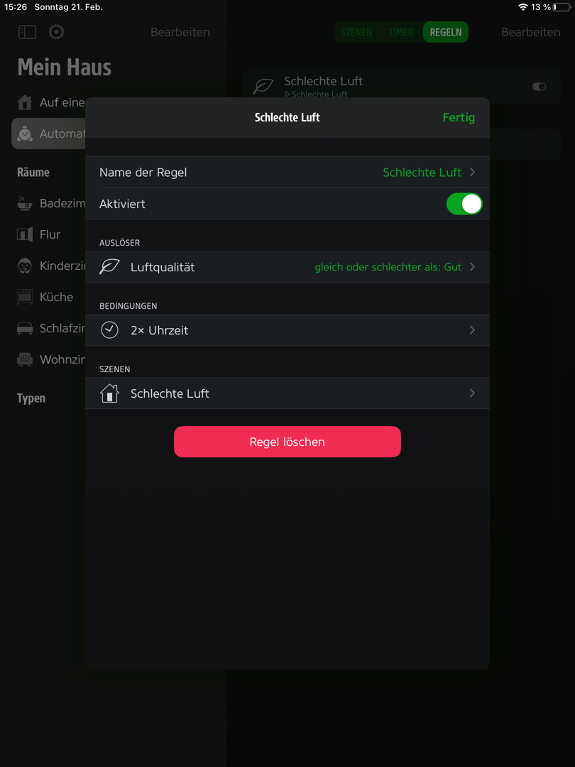 Wenn die Luftqualität gleich oder schlechter als : gut ist sollen 2 Hue Lampen in rot leuchten. Zusatz: nach 7:30uhr vor 23:00uhr und nur wenn jemand zuhause ist, deaktivieren nach 10 Minuten.