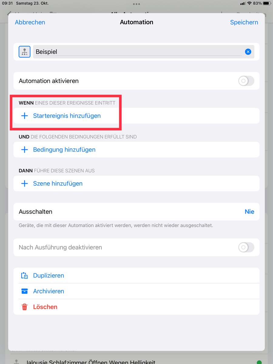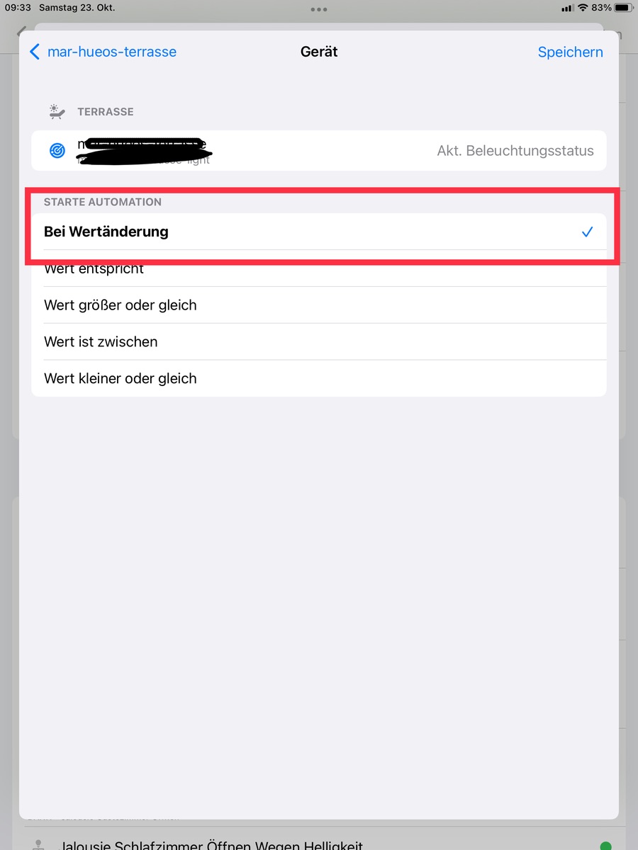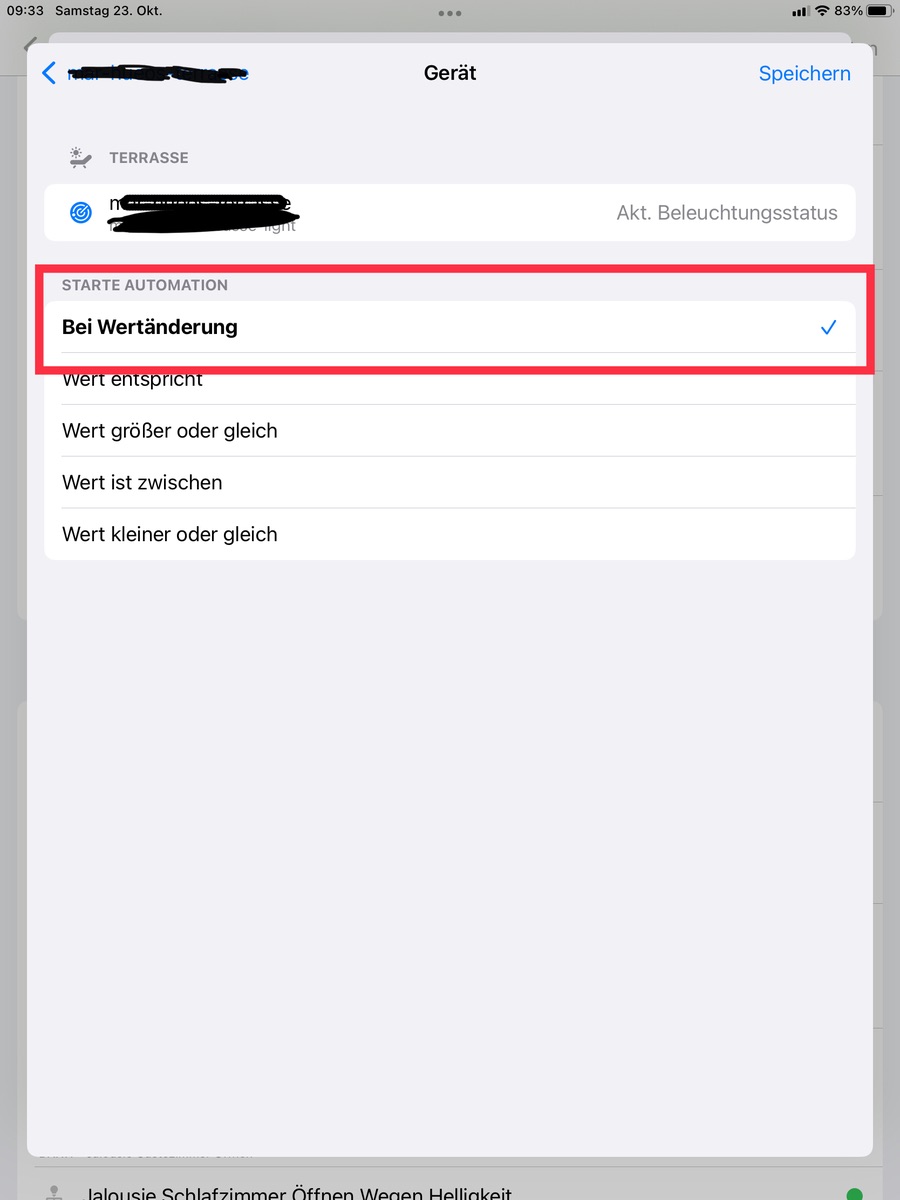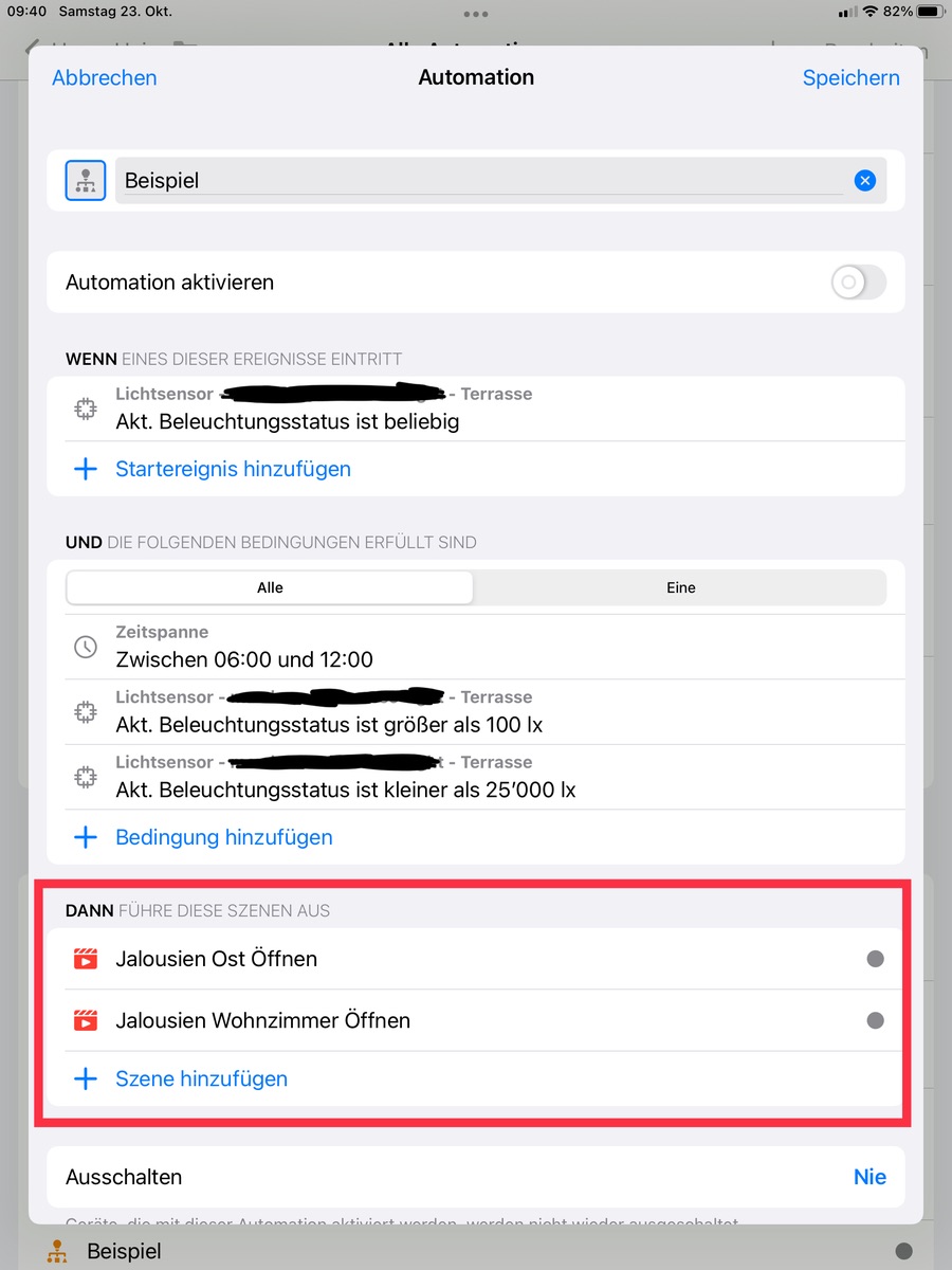 Im Unterschied dieser Automation zu der vorherigen kann HomeKit dies gar nicht detailiert anzeigen und verpfuscht die Automation nicht mit zu niedrigen Luxwerten oder der Gleichen ![]()