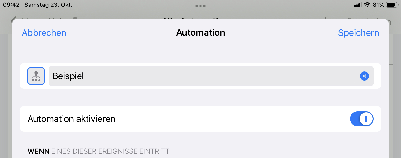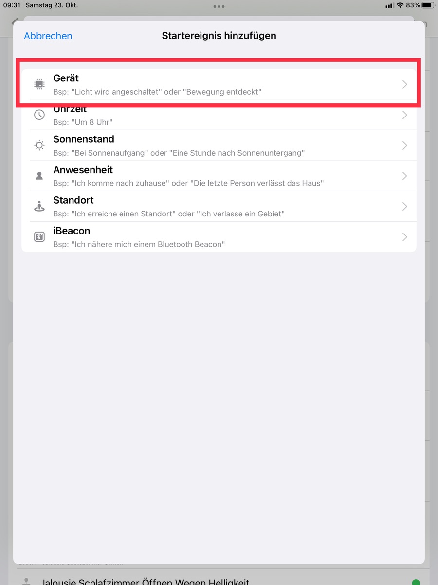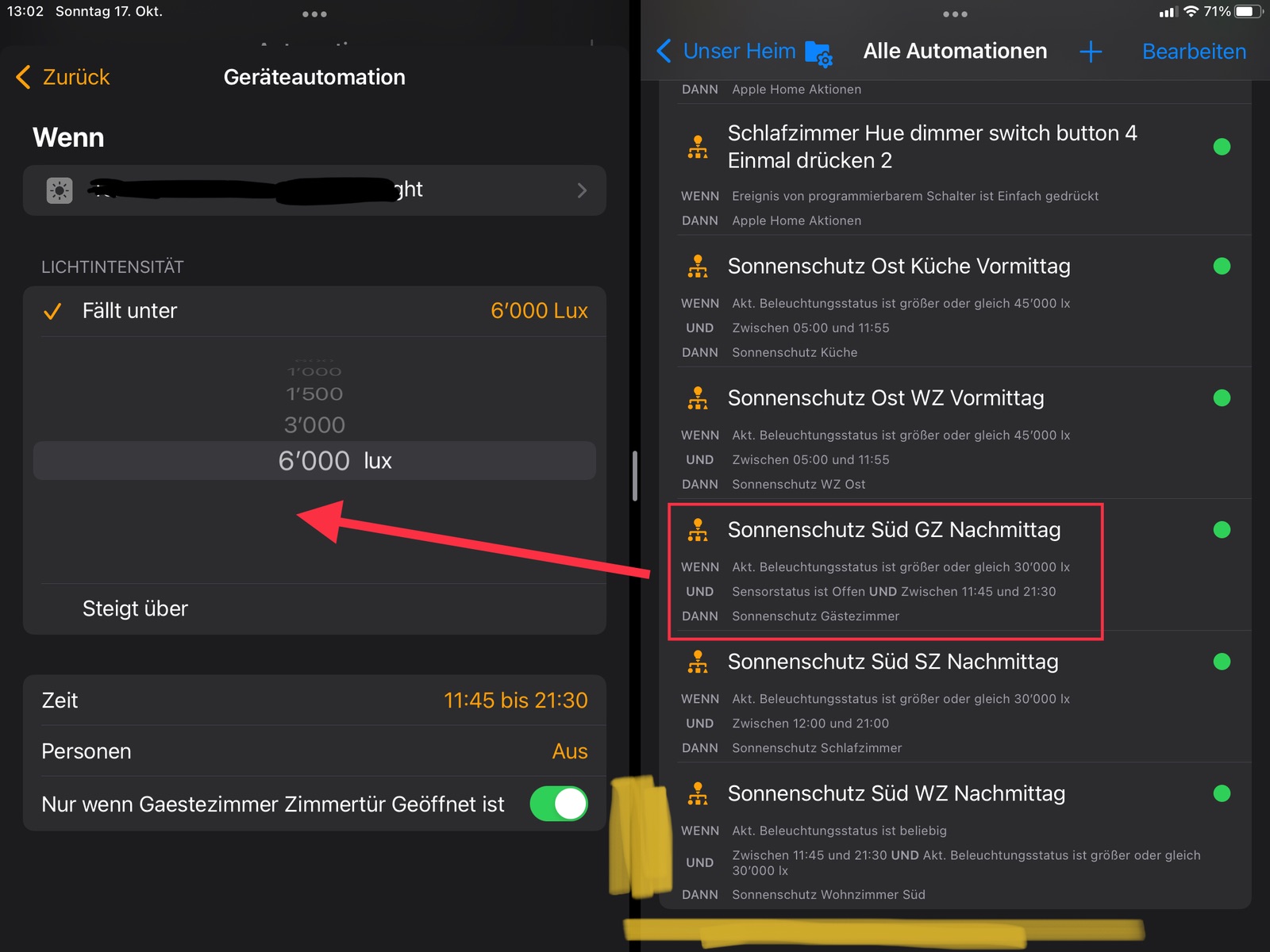 Im Unterschied dieser Automation zu der vorherigen kann HomeKit dies gar nicht detailiert anzeigen und verpfuscht die Automation nicht mit zu niedrigen Luxwerten oder der Gleichen ![]()