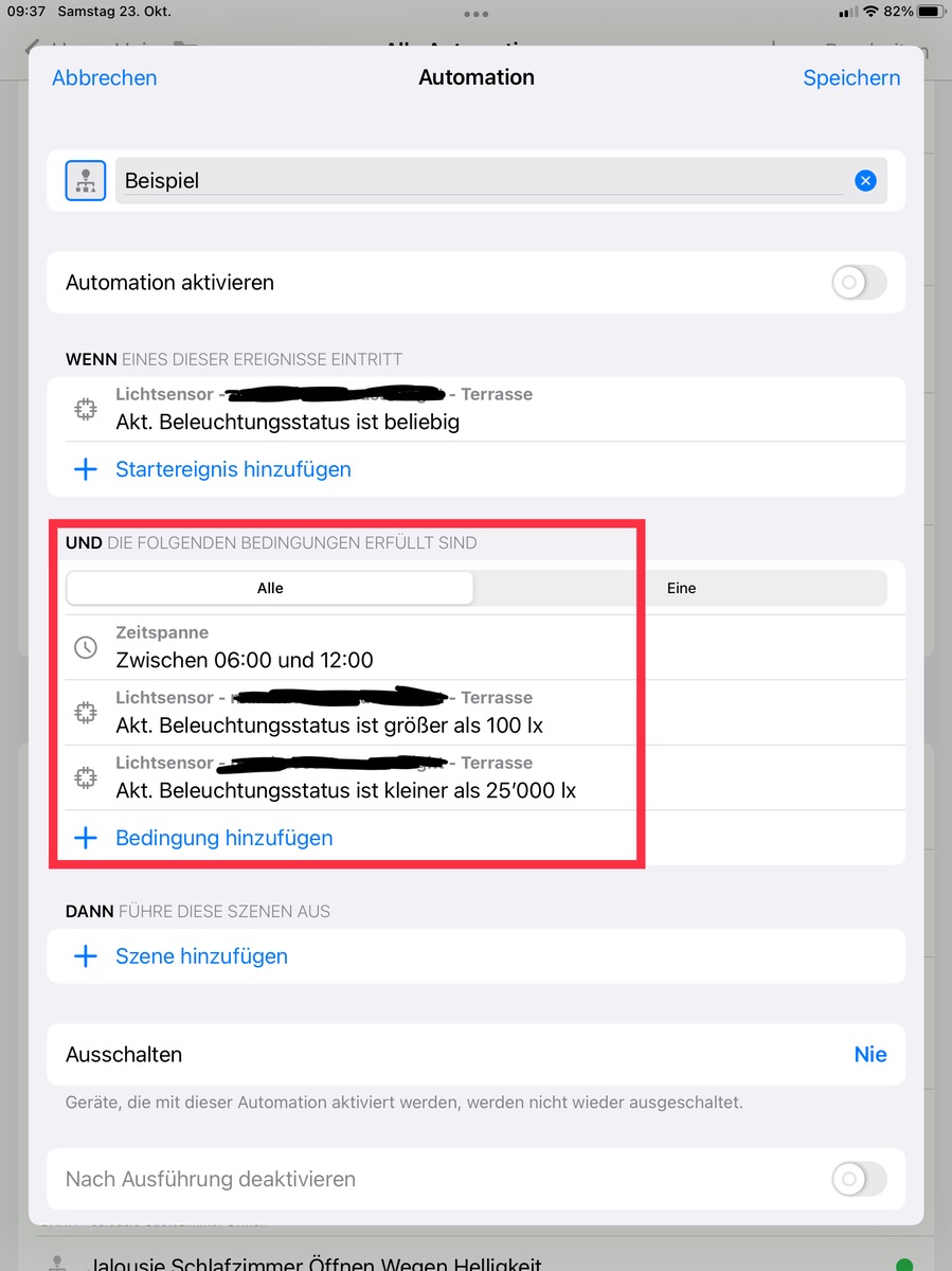 6. Danach erst die weiteren Bedingungen hinzufügen, wie Zeitspanne und Beleuchtungswerte