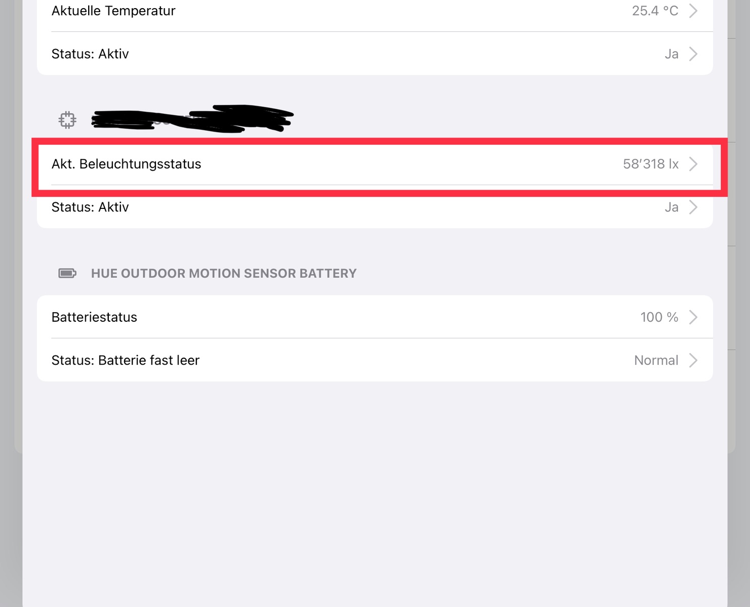 4. Bei meinem Hue Outdoor Sensor den akt. Beleuchtungsstatus wählen