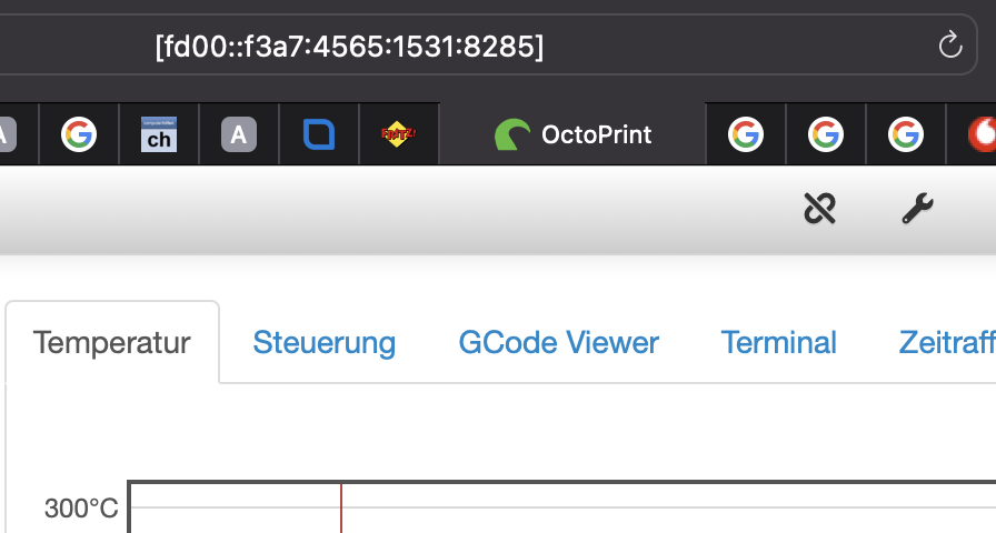 Wenn ich auf den Raspi draufklicke, dann öffnet sich ein neuer Tab im Browser und es startet Octprint (der Raspi wurde mit dem Octopi Image damals installiert)