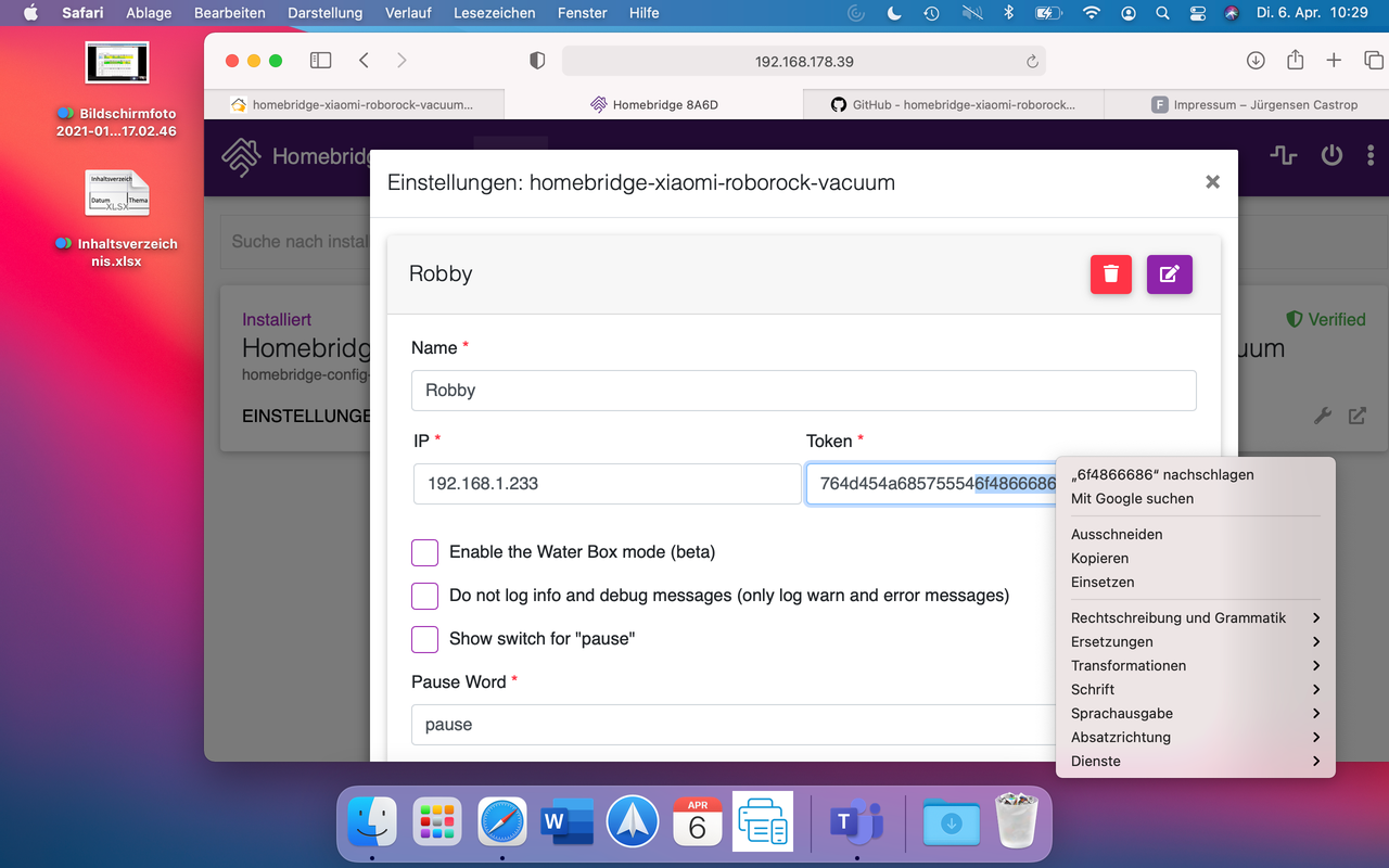 Die IP Adresse von Homebridge bekomme ich ja angezeigt und die vom Robo habe ich mittels Anleitung extrahiert....