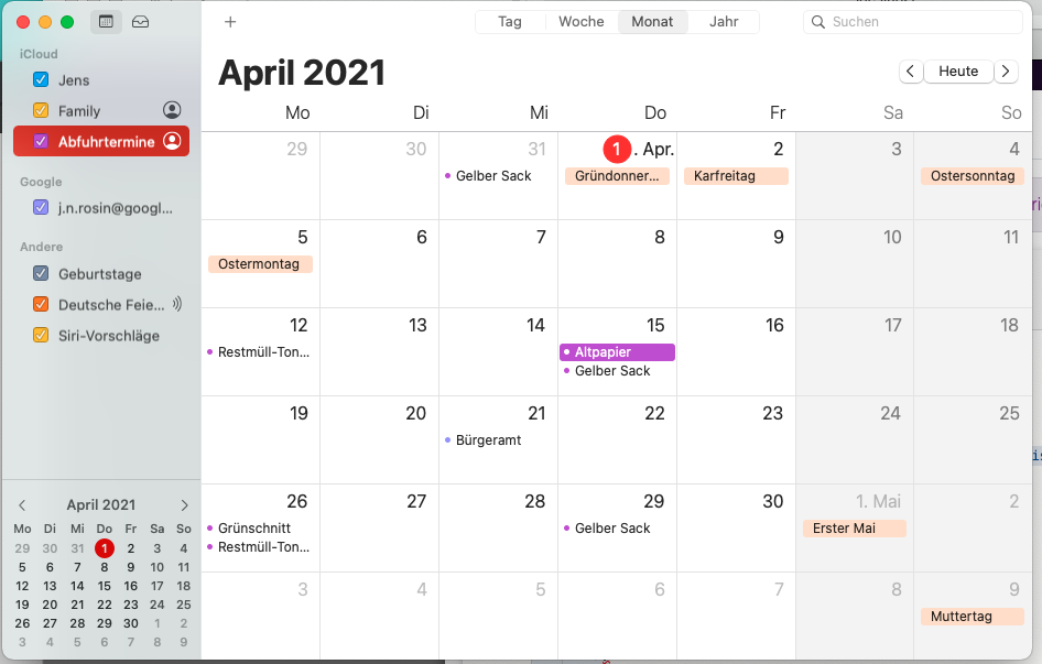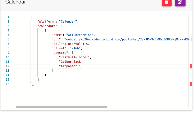 Alles anzeigen{ "platform": "Calendar", "calendars": [{ "name": "Abfuhrtermine", "url": "webcal://p26-caldav.icloud.com/published/2/MTMyMzExMDU3ODEzMjMxMXaKDn8hXaAg852buTEUACuFCp5h-1w1lUcjWidHim83PrgG3Fyfpv7HhiZTrul2eF93rAFB79Zbywdi3E8WsBw", "pollingInterval": 1, "offset": "-16h", "sensors": [ "Restmüll-Tonne", "Gelber Sack", "Altpapier" ] }] }Was genau bräuchtest Du noch bezüglich der Konfiguration?