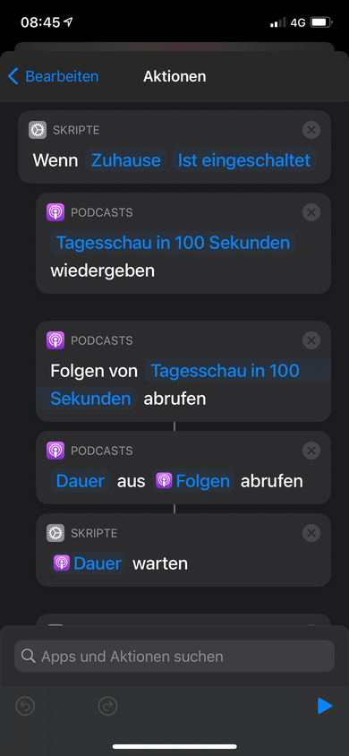 Mein Vorhaben war es das wenn ich zuhause bin und ins Auto einsteige, mein iPhone an CarPlay anschließe. Erste die neuste Folge Tagesschau in 100 Sekunden läuft und anschließend music meinen eigenen Sender! Leider passiert aber nach dem der Podcast gelaufen ist nichts weiter.