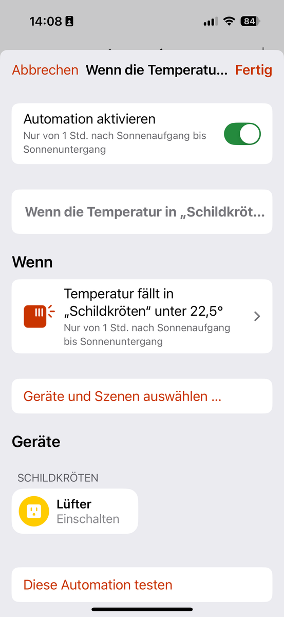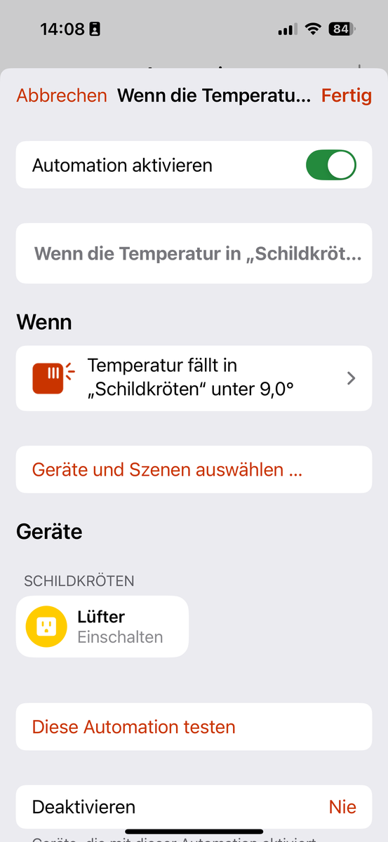 Ich möchte die Mindesttemperatur im Frühbeet für Schildkröten mithilfe eines Heizlüfters sicherstellen. Ich habe noch eine schaltbare Steckdose von Meross übrig. Ich stelle mir das wie folgt vor: Eine Automation in der HomeKit-App misst die Temperatur im Frühbeet (welches Thermometer wäre da angesagt) und schaltet ein, wenn die Temperatur 20°C unterschritten wird ein und wenn die Temperatur 25 °C überschritten wird aus.