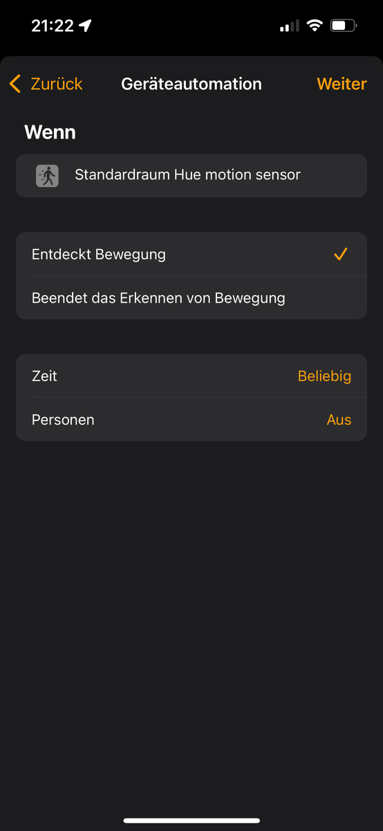 Und zwar würde ich gerne, wenn ich Home die Szene "Gute Nacht" aktiviere, einen Bewegungsmelder für unser Kind scharf schalten – also für den Fall, dass, wenn er wach wird und aufsteht, das Licht an- und nach kurzer Zeit (wenn er bei uns im Bett ist) wieder aus geht. Tagsüber soll der Melder einfach gar nichts machen. Die Einstellung über Tages/Nachtszeiten funktioniert für uns leider nicht, da wir jeden Tag zu deutlich unterschiedlichen Zeiten ins Bett gehen...