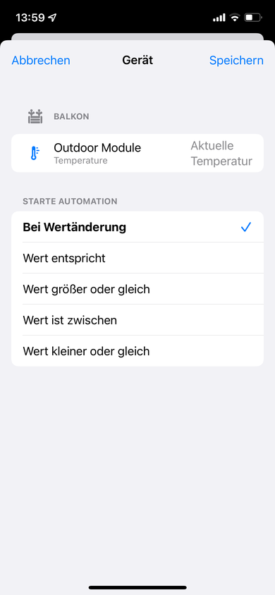 Ich zum Beispiel habe die Außentemperatur von meinem Außenmodul genommen. Das hat den Vorteil: Jedesmal wenn sich die Temperatur ändert wird diese Automatisierung angestoßen und die anderen Werte abgeglichen.