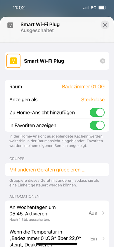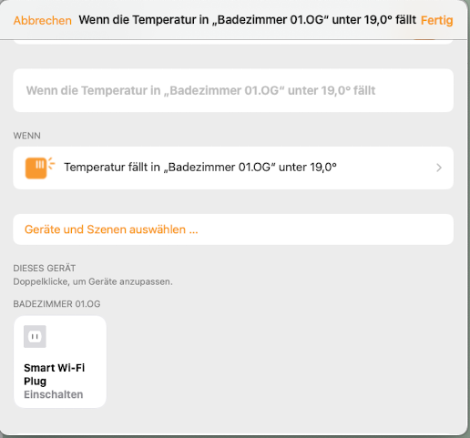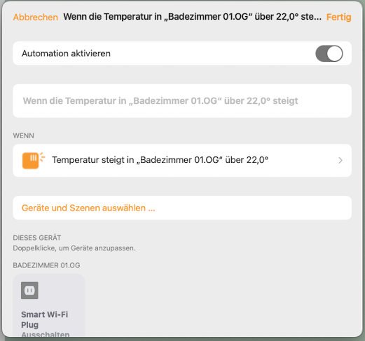 Allerdings kann in der Home nur ein oder aus bei einer bestimmten Temperatur eingestellt werden, wenn Temp über 22Grad dann ausschalten wenn Temp unter 19 einschalten, das funktioniert irgend wie nicht. Muss das in einer anderen App eingerichtet werden? Die Steckdose schaltet bisher ohne RT um 05.45 Bus 06.30 den Handtuchheizkörber. Dazu hätte ich gerne wenn über 22 dann ausschalten