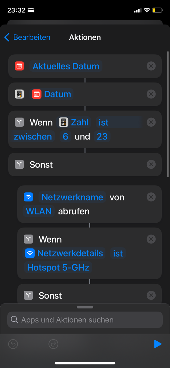 ich brauche mal kurz Hilfe. Ich möchte gerne in der Kurzbefehle App eine Zeit zwischen 5 und 11 abrufen in dem eine Aktion ausgeführt werden kann, aber auch nur in dem Zeitraum, in der anderen Zeit soll nichts passieren. Im Anhang habe ich den aktuellen Zeitraum hinterlegt, der auch funktioniert, aber ich würde lieber gerne den Zeitraum stärker begrenzen. Gebe ich von 5 bis 11 ein wird die Aktion immer ausgeführt.