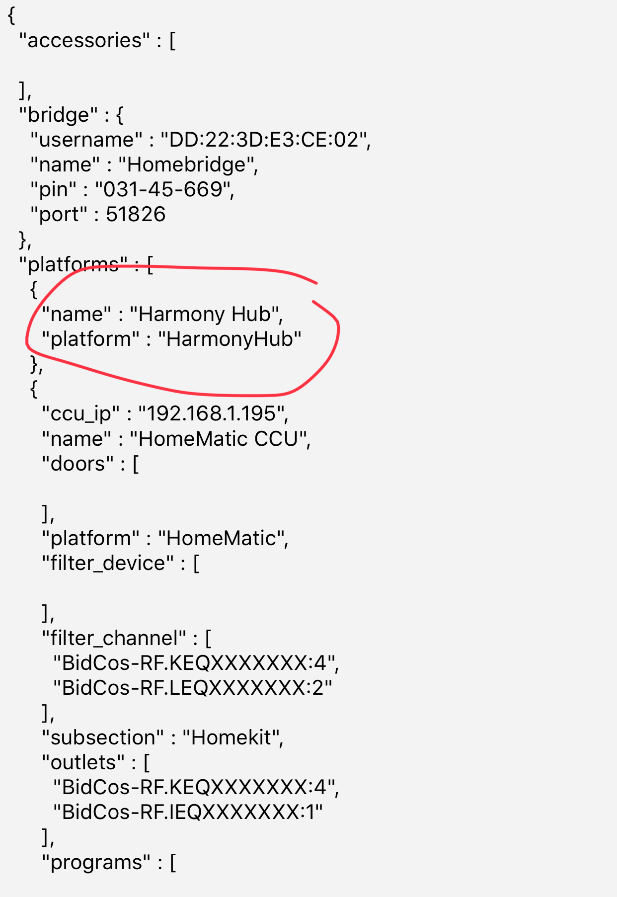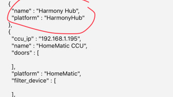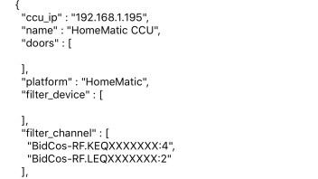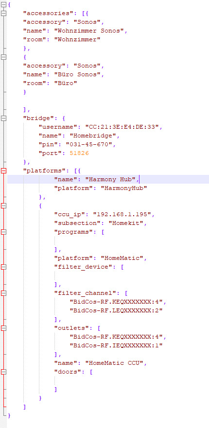 Alles anzeigen{ "accessories": [{ "accessory": "Sonos", "name": "Wohnzimmer Sonos", "room": "Wohnzimmer" }, { "accessory": "Sonos", "name": "Büro Sonos", "room": "Büro" } ], "bridge": { "username": "CC:21:3E:E4:DE:33", "name": "Homebridge", "pin": "031-45-670", "port": 51826 }, "platforms": [{ "name": "Harmony Hub", "platform": "HarmonyHub" }, { "ccu_ip": "192.168.1.195", "subsection": "Homekit", "programs": [ ], "platform": "HomeMatic", "filter_device": [ ], "filter_channel": [ "BidCos-RF.KEQXXXXXXX:4", "BidCos-RF.LEQXXXXXXX:2" ], "outlets": [ "BidCos-RF.KEQXXXXXXX:4", "BidCos-RF.IEQXXXXXXX:1" ], "name": "HomeMatic CCU", "doors": [ ] } ] } -