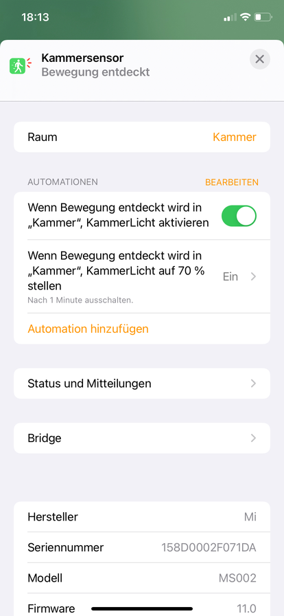 Das Umbenennen hat es leider nicht gebracht. Mit Original-Hue Lampen klappt es übrigens mit dem Bewegungsmelder von Aqara. Da läuft es auch von HomeKit über die Hue-Bridge.