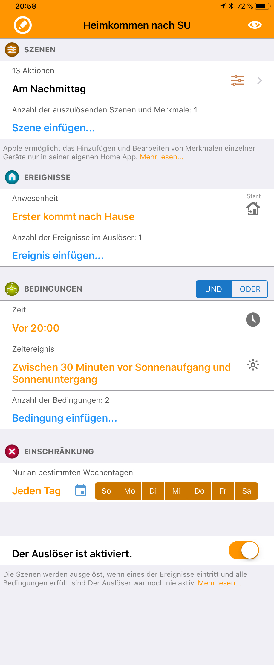 Seltsamerweise geht das anlegen solcher Regeln nicht mehr mit der aktuellen Version der nicht Apple Home App, vorher waren Sonnenuntergang und Aufgang zwei Bedingungen von denen ich eine einfach gelöscht habe.