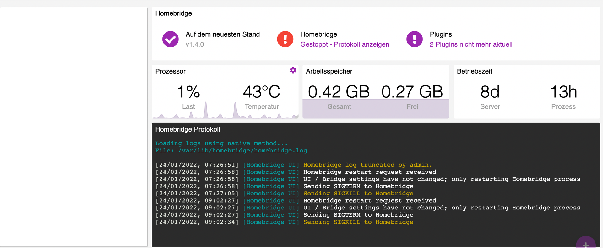 [24/01/2022, 09:02:27] [Homebridge UI] UI / Bridge settings have not changed; only restarting Homebridge process