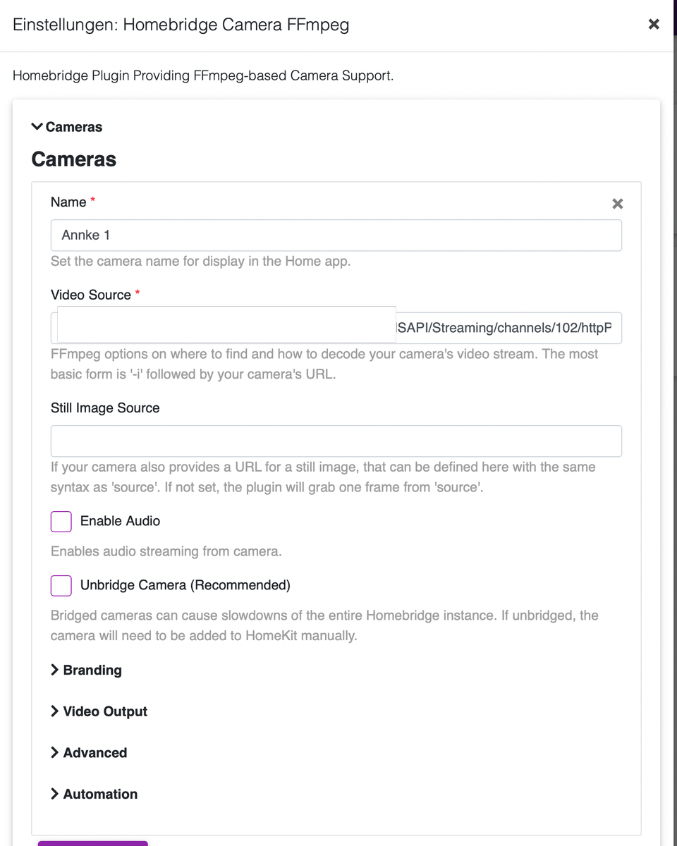 Via http und vlc /rtsp ist der link richtig, aber in Homebridge wird die camera nicht sichtbar, kann jemand über meine config schauen?