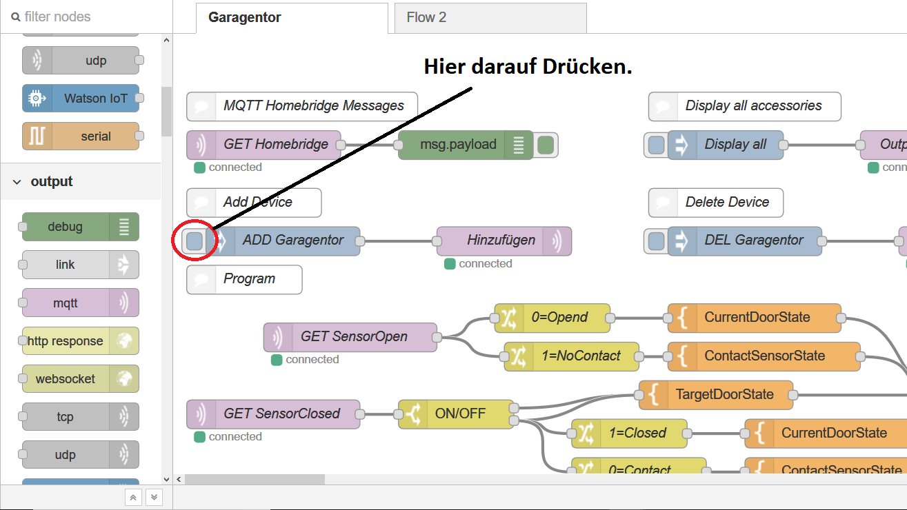 Jetzt brauchen wir das ganze nur noch zu aktivieren für Homebridge. Dazu Drücken wir einmal auf diesen Button (ADD Garagentor). Und euer Garagentor sollte sofort auf eurem Homekit zusehen sein.