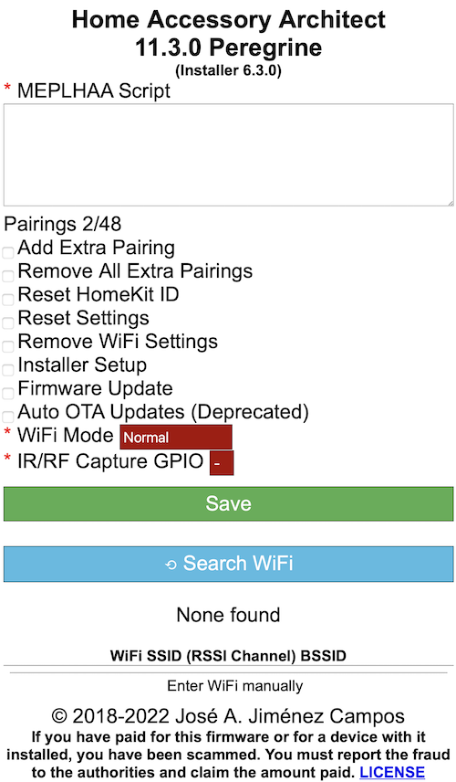 Der ESP erscheint dann nach einiger Zeit als eigener WLAN Access Point unter den "Netzwerken in der Nähe" mit seinem Namen bzw. der SSID "HAA-xxxxxx" (wobei x für einen aus der MAC-Adresse des ESP generierten Teil besteht). Dieses Netzwerk muss ausgewählt werden, um dann anschließend im Browser die lokale ESP-Webadresse http://192.168.4.1:4567 einzugeben. Es sollte das (ähnliche) Setup-Fenster aufgebaut werden: