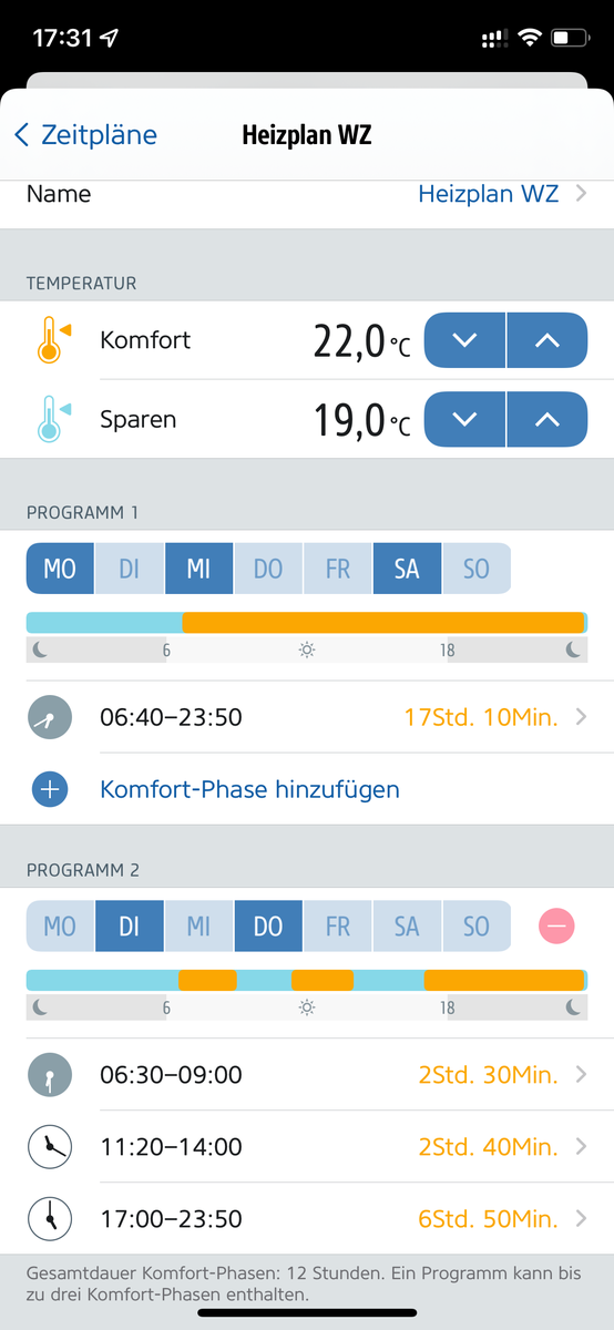 In dem Raum läuft allerdings kein Heizplan. Morgens nach dem Lüften wird mit den Schliessen des Fensters wieder die Tag-Temperatur gesetzt.