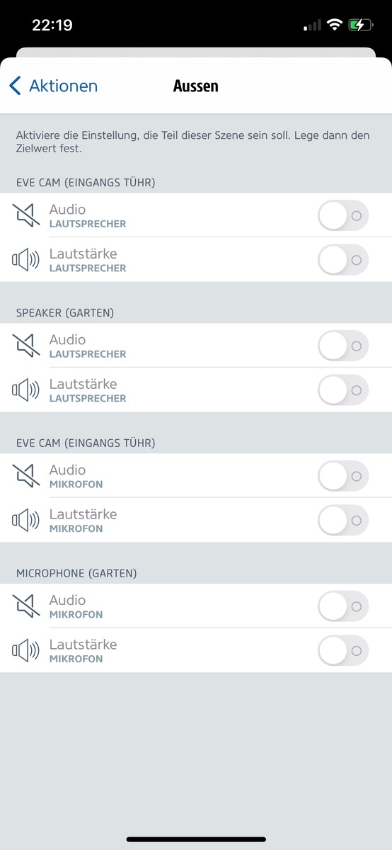 Ja soweit so gut habe in der Eve app nach geschaut da kann man leider nur die Funktionen Lautsprecher und Mikrofon ausschalten
