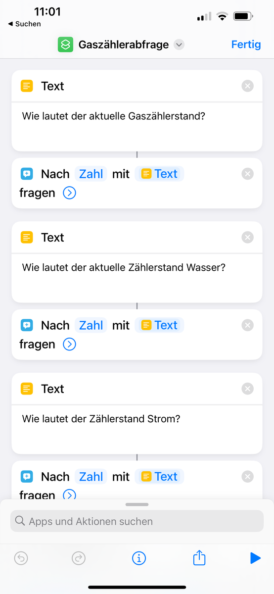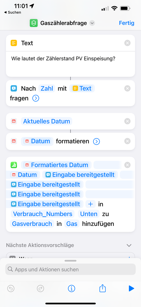 Ein NFC-Tag im Heizungsraum löst den Kurzbefehl aus in dem nacheinander die Zählerstände für Gas, Wasser, Strom und PV-Einspeisung abgefragt werden, welche danach automatisch in einer Numbers-Tabelle gesammelt werden.