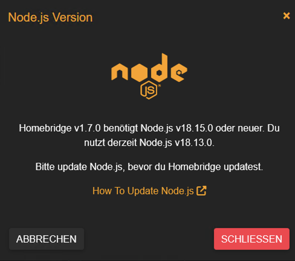 Beim Versuch des updates wird mir angezeigt, dass ich erst node.js (hier läuft v18.13.0) auf v18.15.0 updaten muss.