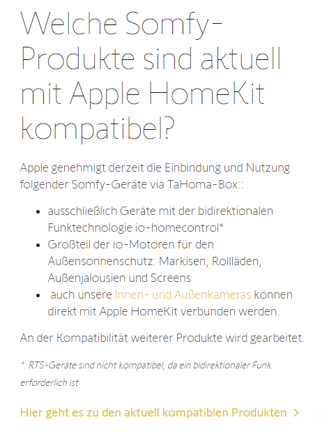 In diesem PDF auf der Somfy Seite sind die HomeKit kompatiblen Modelle aufgelistet: https://service.somfy.com/down…tetahoma_applehomekit.pdf