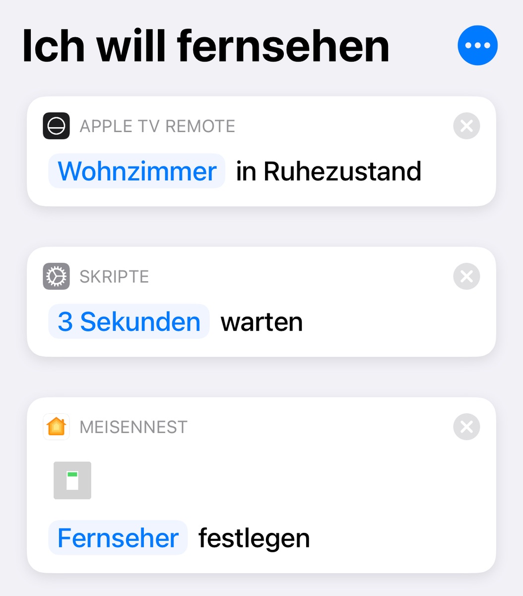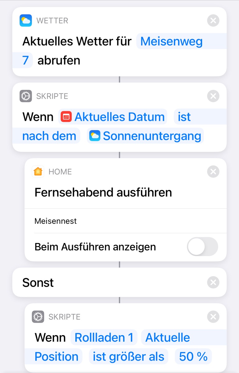 ich habe einen Shortcuts Kurzbefehl erstellt, der den Fernseher einschalten soll und dann prüfen soll, ob draußen noch die Sonne scheint, oder ob es schon dunkel ist. Wenn es noch hell ist, sollen die Rolläden ein Stück heruntergefahren werden, wenn sie es nicht schon sind, ansonsten sollen sie oben bleiben. Wenn ich den Befehl über Shortcuts starte, klappt auch alles. Wenn ich Siri auffordere, passiert nix mit den Rolläden. Hat jemand ne Idee, woran das liegt?