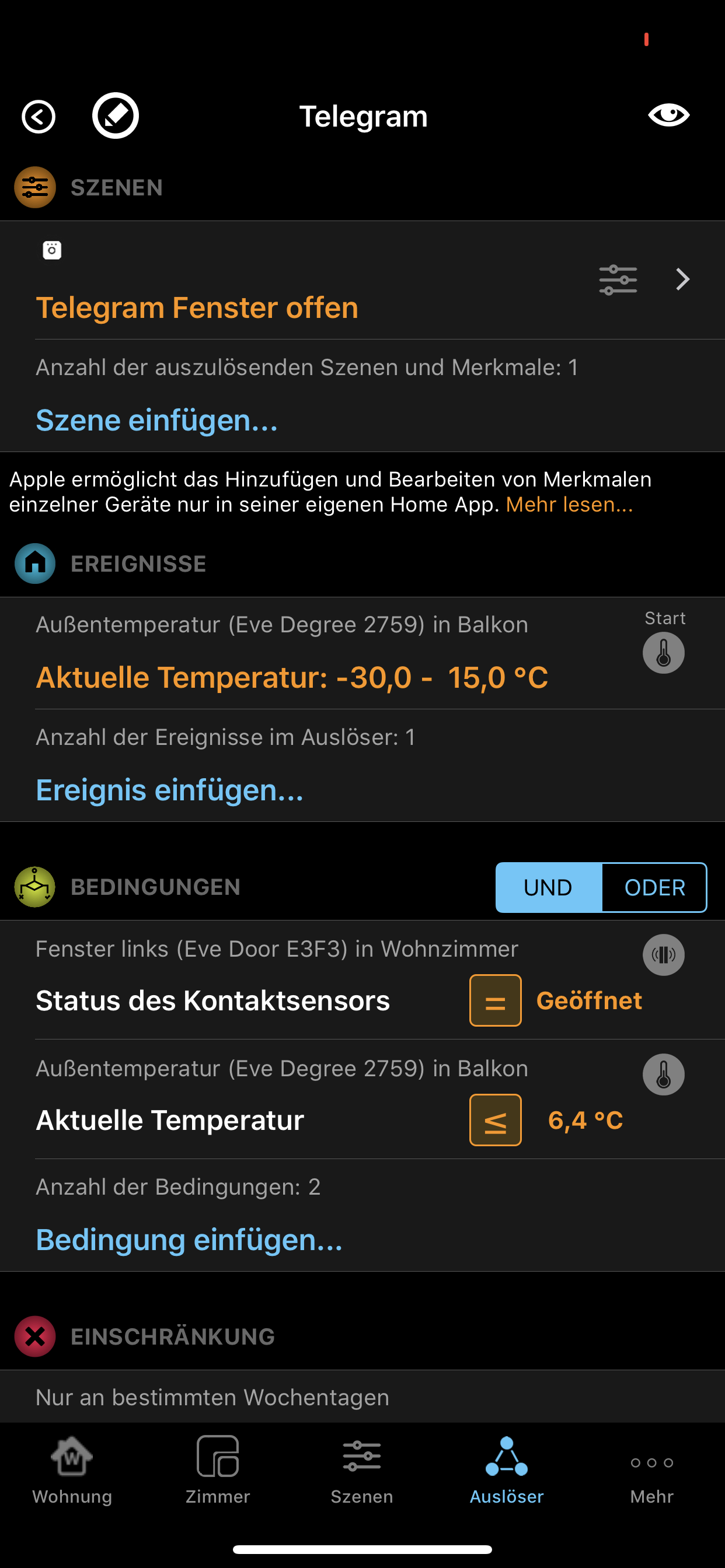 Dein Wunsch mit der Telegram-Nachricht wirst Du so einfach nicht hinbekommen, denn HomeKit erlaubt es leider nicht Werte aus einem Sensor direkt an einen anderen zu übertragen