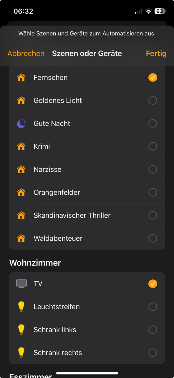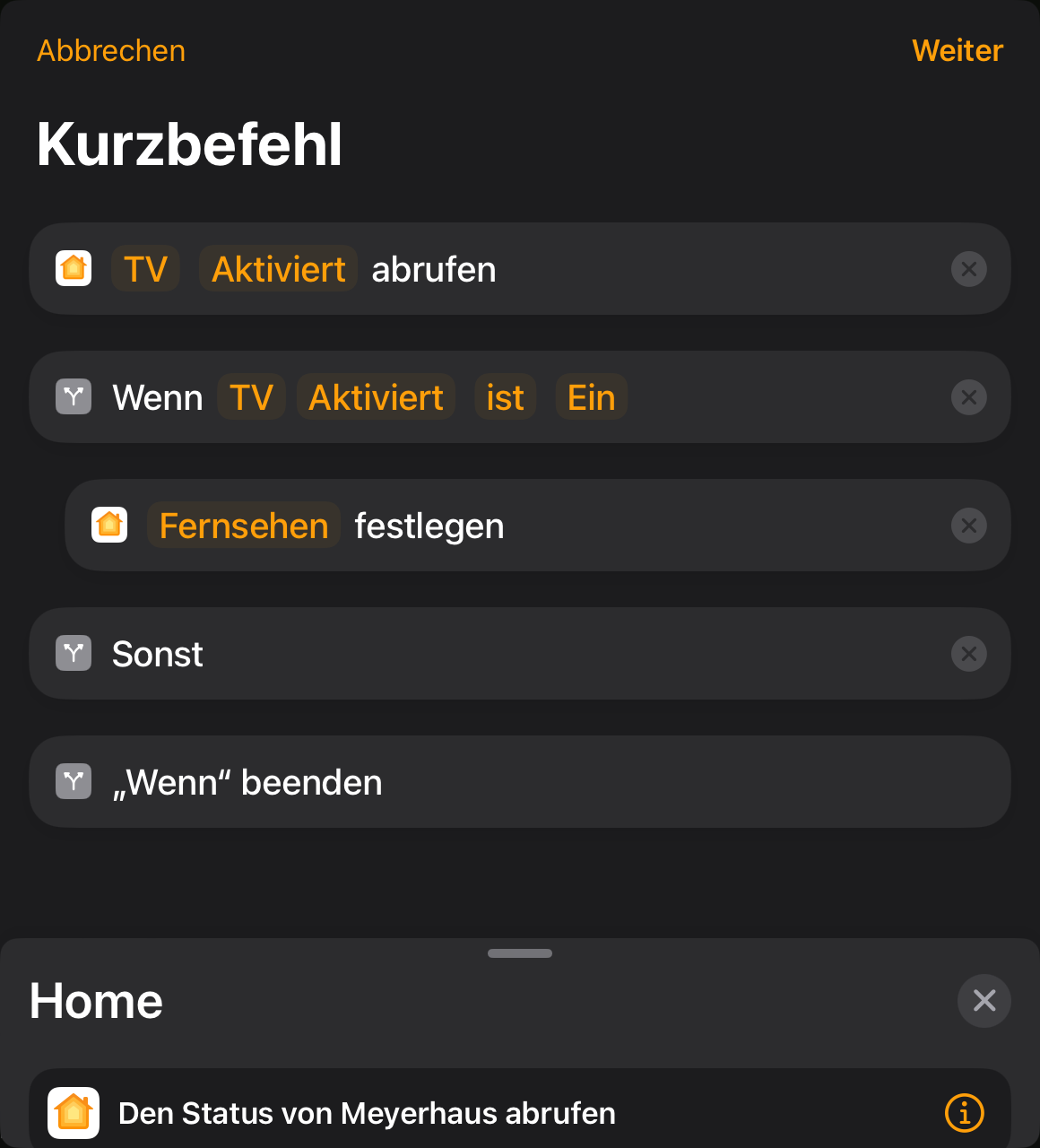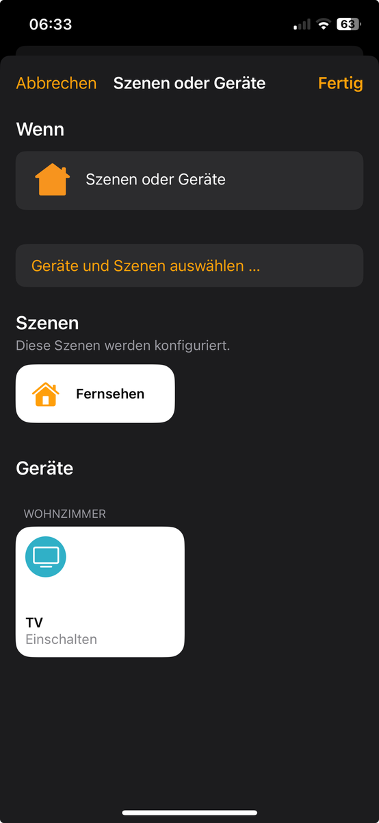 Die entscheidende Stelle sieht aber auch in meiner Home-App ganz anders aus als bei den Screenshots oben. Nachdem ich Szenen und Geräte ("Fernsehen" und TV) ausgewählt habe klicke ich ganz unten auf "In Kurzbefehl konvertieren" (Bild 1). Dann sehe ich Bild 2. Gehe ich dann unten bei "Geräte" auf TV, sehe ich Bild 3. Wozu die Auswahl "AirPlay", "PS5" oder "Live TV" da ist, kann ich nicht sagen. Offenbar kann der Fernseher zurückmelden, was gerade läuft, um andere Szenen zu starten.