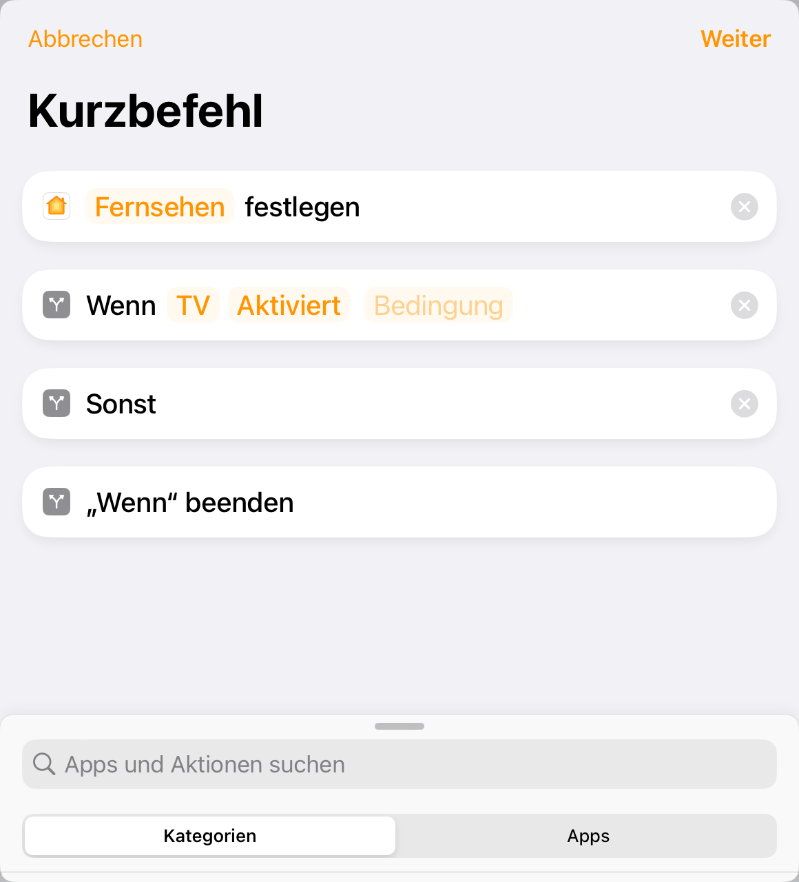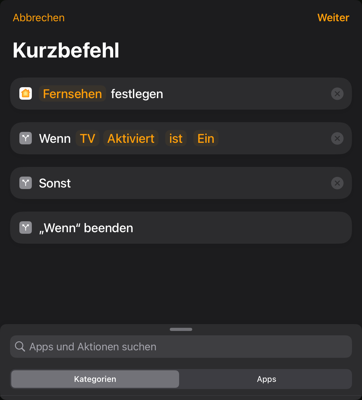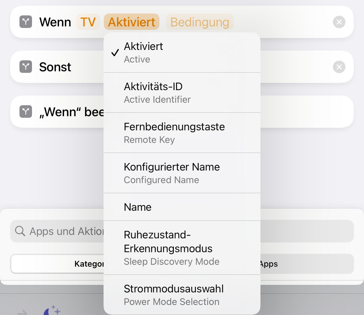 OK, danke, ich probiere das mal. Bei mir sieht die TV-Bedingung nur anders aus. Ich kann bei „Wenn“ und „TV“ nicht „Ist eingeschaltet“ auswählen, sondern nur „Aktiviert“. Das läßt offen, ob es abfragt, ob er eingeschaltet ist, oder ob man ihn dann aktivieren (also einschalten) muß. Kann aber sein, daß du eine Steckdose „TV“ genannt hast, denn ich habe auch irgendwo bei dir „Status der Stromversorgung“ gelesen. Diese TV-Abfrage ist der Knackpunkt bei mir.