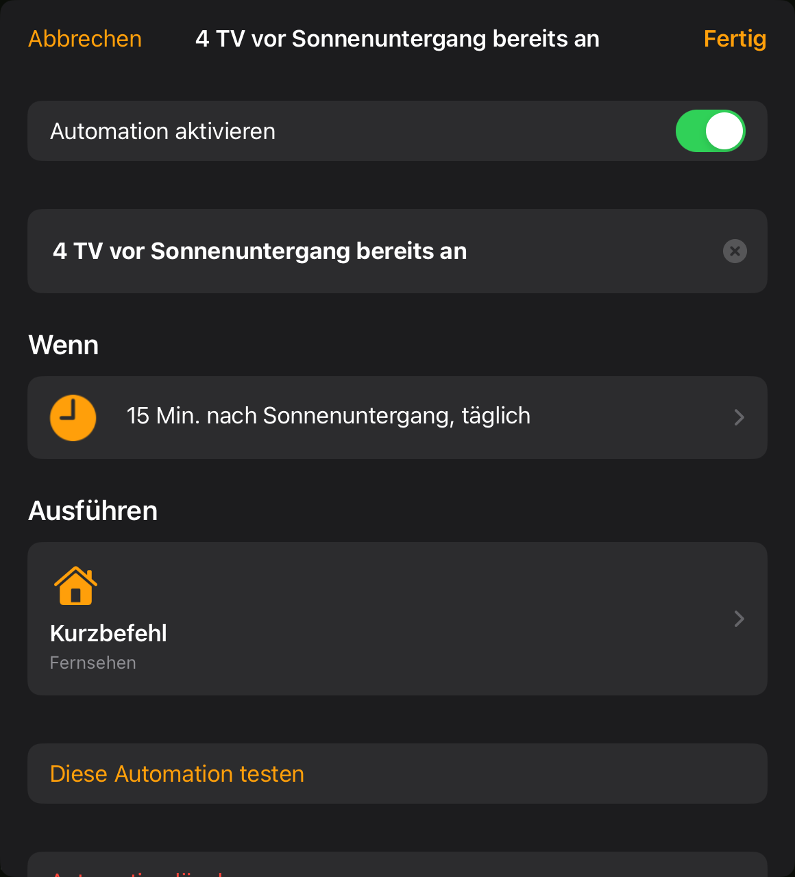 Hat leider nicht funktioniert. Die Szene „Fernsehlicht“ wird 15 Minuten nach Sonnenuntergang gestartet, obwohl der TV nicht eingeschaltet (wohl aber auf Standby) ist. Die Abfrage, ob er an ist, funktioniert also wie bisher nicht. Hat noch jemand einen Tipp? Es ist alles eingestellt wie auf den iPad-Screenshots in meinem letzten Beitrag oben zu sehen. Ich verstehe nicht, warum diese Prüfung nicht funktioniert.