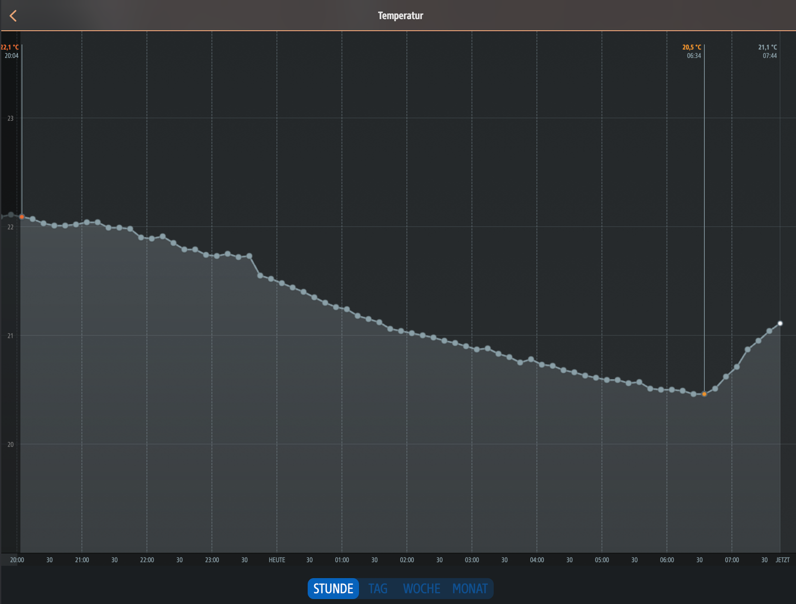 Wie zu sehen ist die Temperatur von 22 Grad Celsius um ca. 07.45 Uhr nicht erreicht.