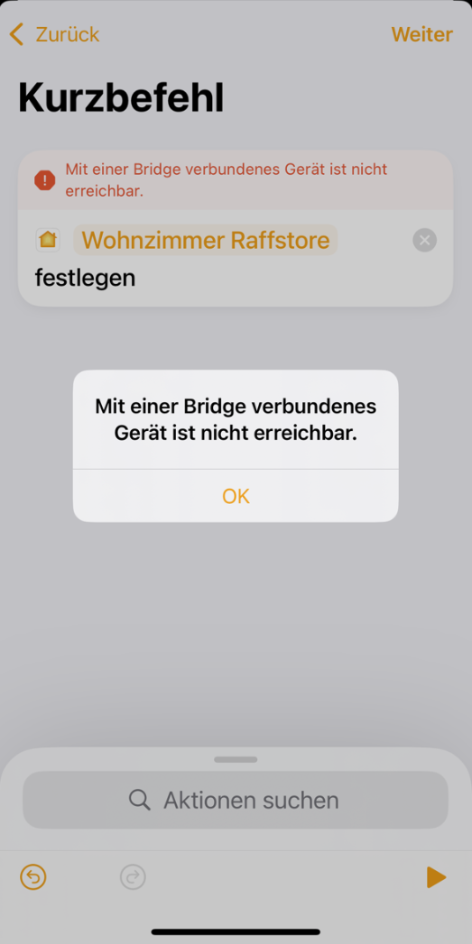 Leider kriegt man in HomeKit Automationen aber sehr häufig diese Fehlermeldung lt. Screenshot. Die gewünschte Aktion wird zwar richtig ausgeführt, allerdings scheint die Rückmeldung an HomeKit zu lange zu dauern oder fehlerhaft zu sein, wodurch die Fehlermeldung erscheint (wenn man die Automation testet - da man sich wundert, warum die wieder nicht (vollständig) gelaufen ist). Das führt leider dazu, dass dann komplexere Automationen mittendrin abgebrochen werden und die Schritte danach gar nicht mehr ausgeführt werden.