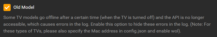 Alles anzeigen"name": "BraviaTVOS", "platform": "BraviaOSPlatform", "debug": true, "warn": true, "error": true, "extendedError": true, "tvs": [ { "active": true, "name": "Wohnzimmer TV", "ip": "192.168.1.21", "port": 80, "psk": "03145154", "manufacturer": "Sony", "model": "Bravia", "serialNumber": "00000000", "refreshInputs": false, "wol": false, "oldModel": false, "polling": 10, "sheduledRefresh": 12, "inputs": [ { "name": "Apple TV", "identifier": "Wohnzimmer App", "source": "cec" }, { "name": "PlayStation 5", "identifier": "PlayStation 5", "source": "cec" } ], "displayOrder": [ "inputs", "apps", "channels", "commands", "macros" ], "speaker": { "active": false, "output": "speaker", "increaseBy": 1, "reduceBy": 1, "accType": "lightbulb" }, "commands": [], "macros": [], "remote": [] }, { "active": true, "name": "Schlafzimmer TV", "ip": "192.168.1.30", "mac": "14:2d:27:0b:de:33", "port": 80, "psk": "03145154", "manufacturer": "Sony", "model": "Bravia", "serialNumber": "00000000", "refreshInputs": false, "wol": true, "oldModel": true, "polling": 10, "sheduledRefresh": 12, "displayOrder": [ "inputs", "apps", "channels", "commands", "macros" ], "speaker": { "active": false, "output": "speaker", "increaseBy": 1, "reduceBy": 1, "accType": "lightbulb" }, "channels": [], "commands": [], "macros": [], "remote": [] } ] }, { "pollInterval": 5000, "platform": "playstation" }Eigentlich sollte die Einstellung "Old model" ja genau das verhindern, oder?
