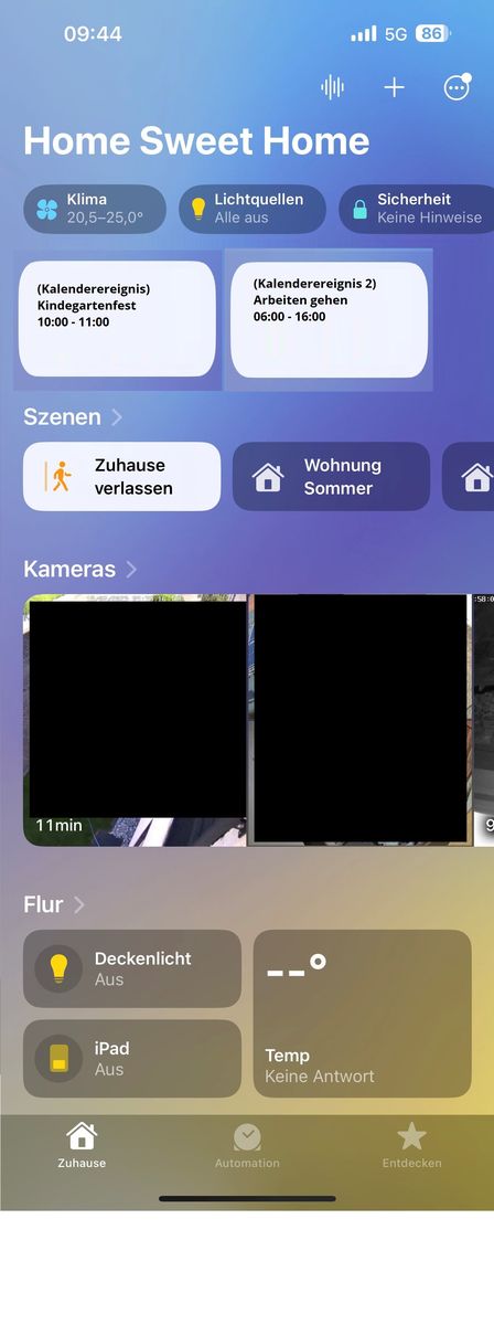 - Kalender Ereignisse in HK anzeigen: Am liebsten wäre es mir, wenn in der Übersichtsseite die täglichen Kalenderereignisse angezeigt werden, oder es zumindest einen Button gibt, mit dem man es abrufen könnte (ohne aus dem Geführten Zugriff zu gehen). Sinn dahinter: Apple Familienkalender, soll angezeigt werden. Beispielbild HK Kalender