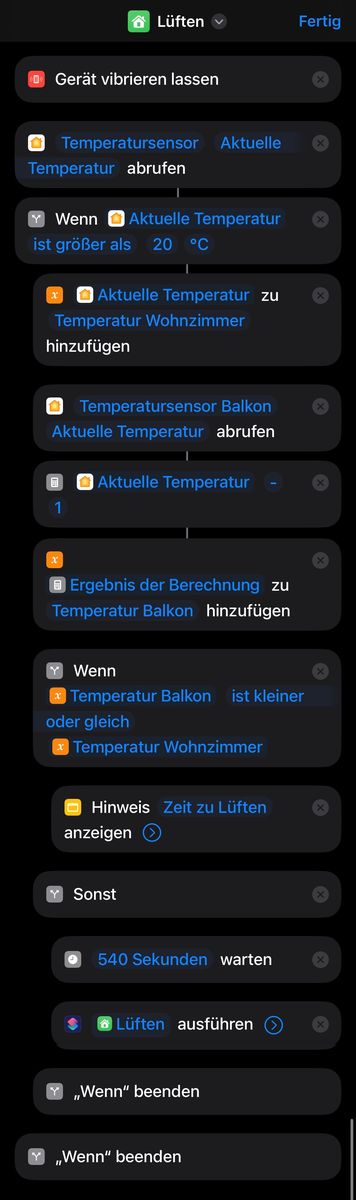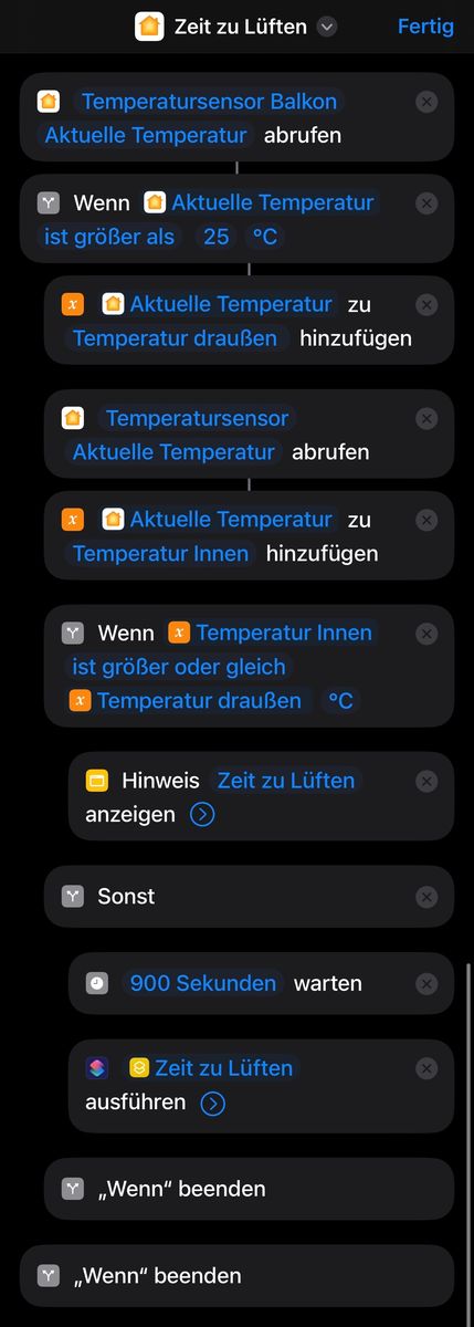 Ich habe den Kurzbefehl mal angehängt. Diesen lasse ich nach der Idee von Mia jeden Tag um 16 Uhr starten....ein anderer Trigger zwecks Automation als der Zeitwert fällt mir auch nicht ein - aber ich denke, damit wird das ganz gut funktionieren. Normalerweise sollte die Automation dann alle 15 Min(900 Sekunden) ab 16 Uhr den Kurzbefehl durchrattern und abfragen. Und das solange, bis die Meldung "Zeit zu Lüften" an mich rausgeht.