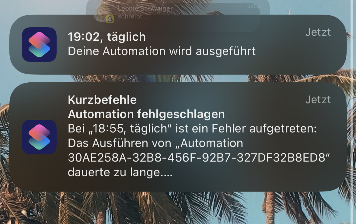 Dann habe ich noch einen erneuten Kurzbefehl erstellt und verlinkt, der dann einfach nur als Timer und neuer Trigger dienen soll - macht er auch nicht…diesen startet er nicht mal per verlinktem „Kurzbefehl ausführen“.