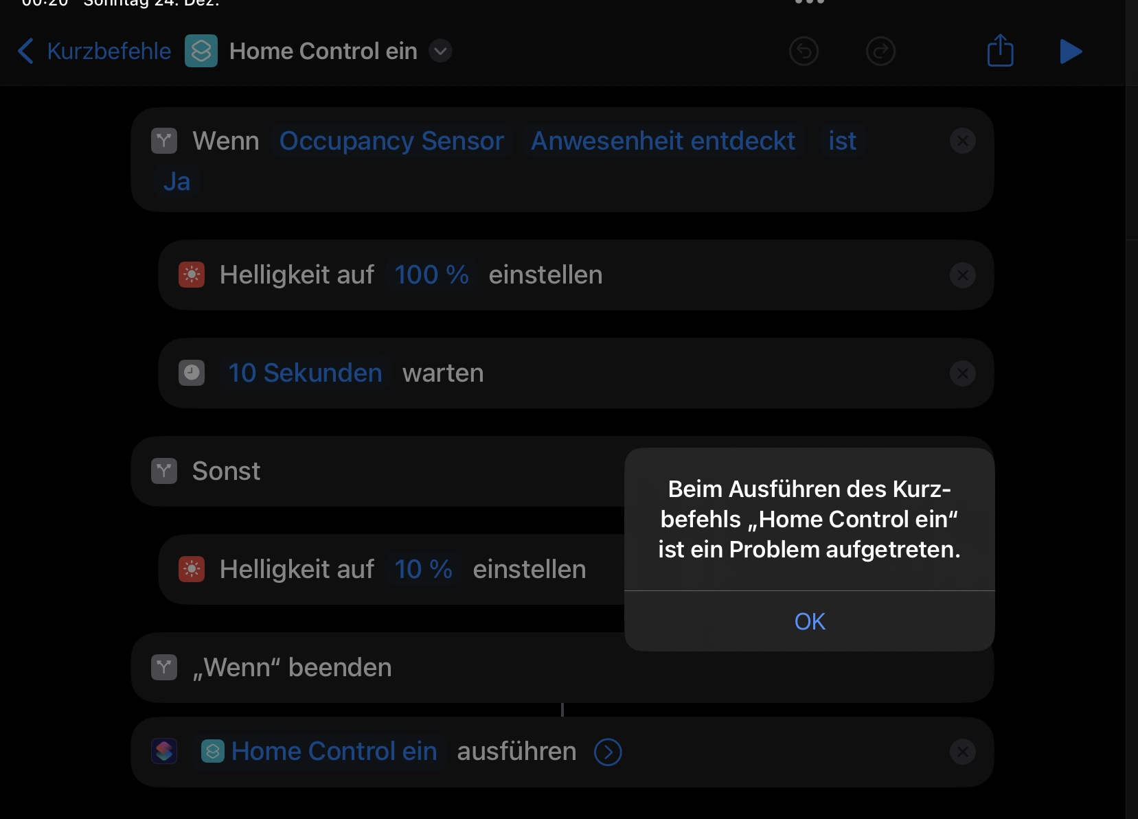 Ich möchte dem Bildschirm meines fest als zentrales Bediengerät verbauten iPads (“Home Control”) mit Hilfe des Aqara Anwesenheitsmelders ein- und ausschalten, so dass der bei Nichtanwesenheit auf z.B. 10% Helligkeit schaltet.