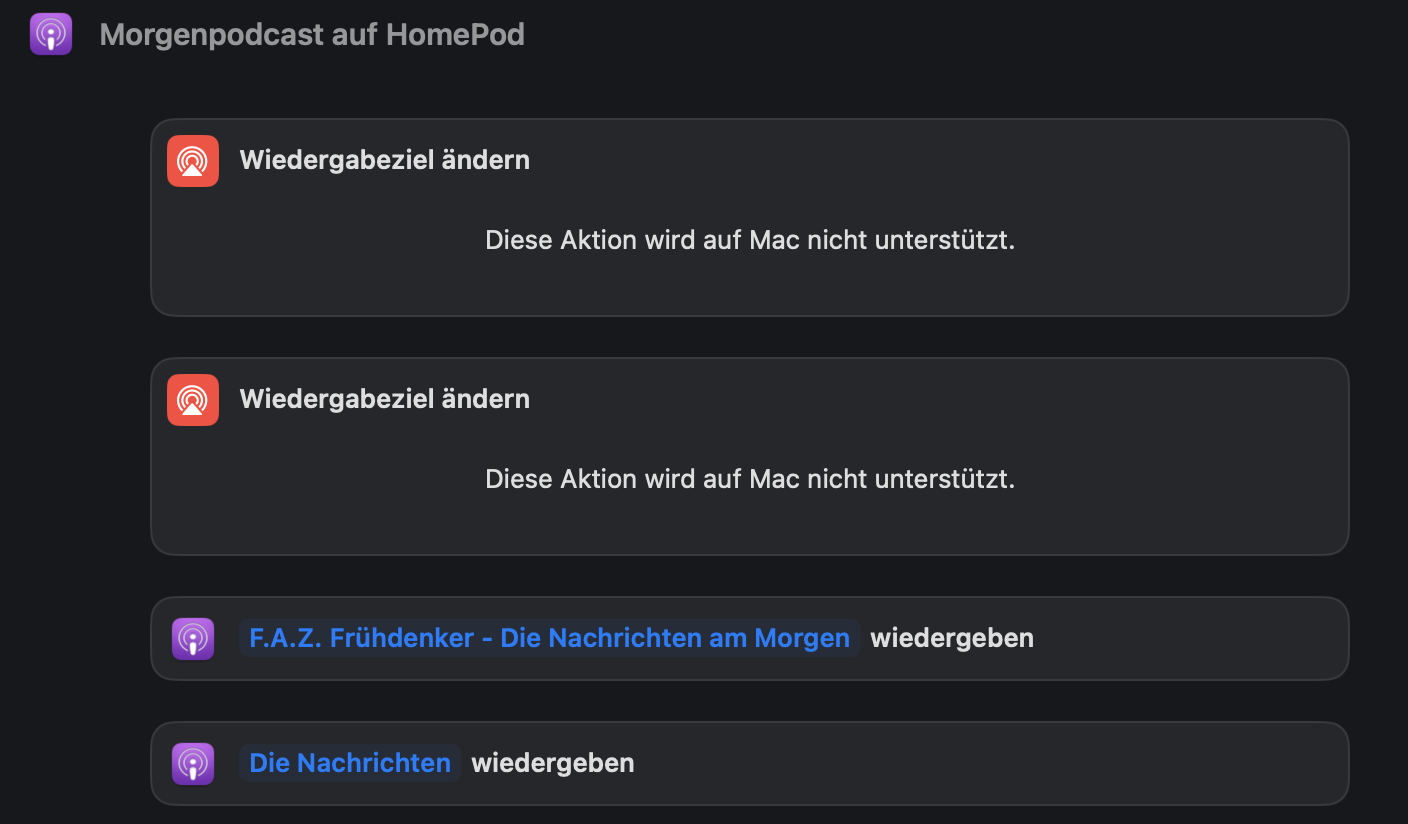 mehrere Podcast nacheinander abspielen hannesvw 27. November 2024 Hallo,ich würde über Kurzbefehle gerne mehrere verschiedene Podcast nacheinander abspielen. Es wird aber immer nur der letzte Podcast abgespielt. Hat jemand eine Idee?Danke.Hannes