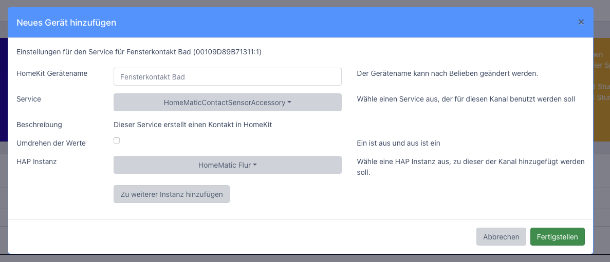 Darüber habe ich jetzt die Fensterkontakte in Apple Homekit hinzugefügt, was auch funktioniert.