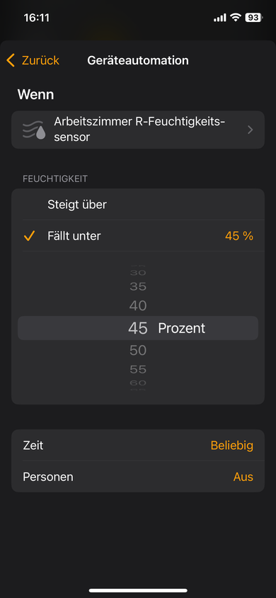 Ich habe ein Problem mit einer Automation. Ich nutzte Apple Homekit und parrallel die Eve App. Ich habe eine Automation erstellt, die eine Steckdose (Merros), an der ein Luftbefeuchter hängt, in Abhängigkeit der Luftfeuchtigkeit eines Eve Room schaltet. Eine Automation, die die Steckdose bei Unterschreizung eines Wertes anschaltet, und eine Automation, die die Steckdose bei Überschreitung eines Wertes ausschaltet. Ich habe beide Automationen bereits auf unterschiedliche Weise, sowohl in Homkit als auch in der Eve App angelegt. Wenn ich im Homekit die Automation teste, dann wird die Steckdose auch so geschaltet wie erwartet. Aber leider funktioniert die Automation im Normalbetrieb nicht. Die Steckdose wird weder an noch ausgeschaltet.