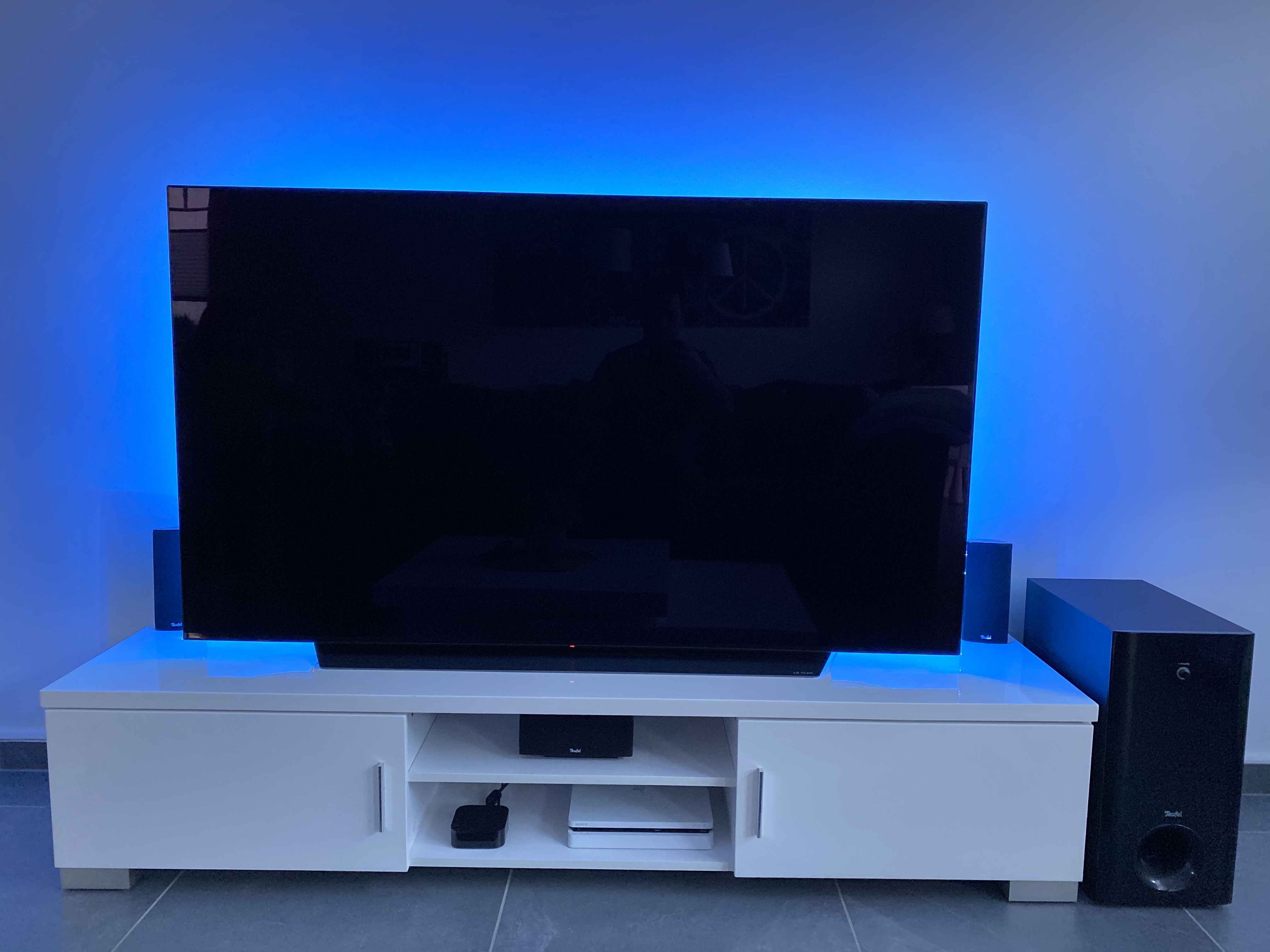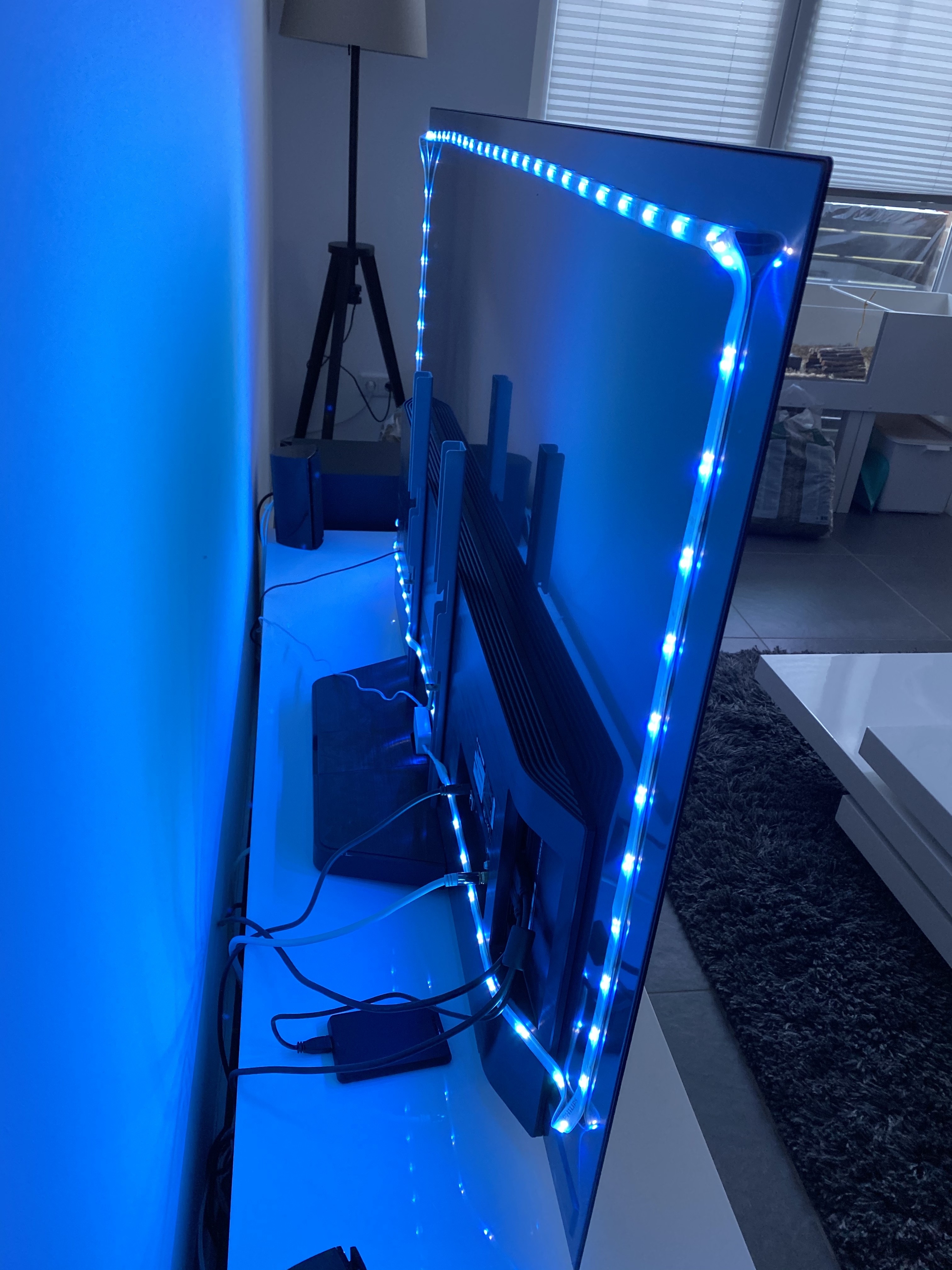 Das fehlende Ambilight, weshalb ich ursprünglich einen Philips haben wollte, habe ich jetzt erstmal mit einem Hue Lightstrip auf der Rückseite kompensiert (siehe Bilder).