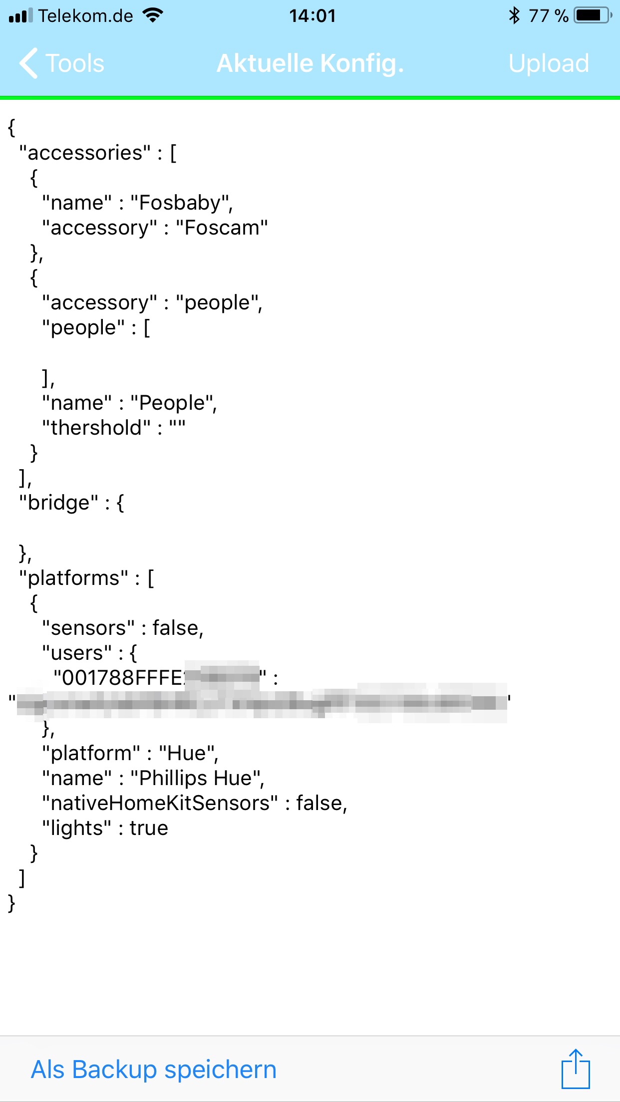 Wenn ich in der Homebridge App auf Konfiguration manuell bearbeiten klicke wird mir dies angezeigt. -